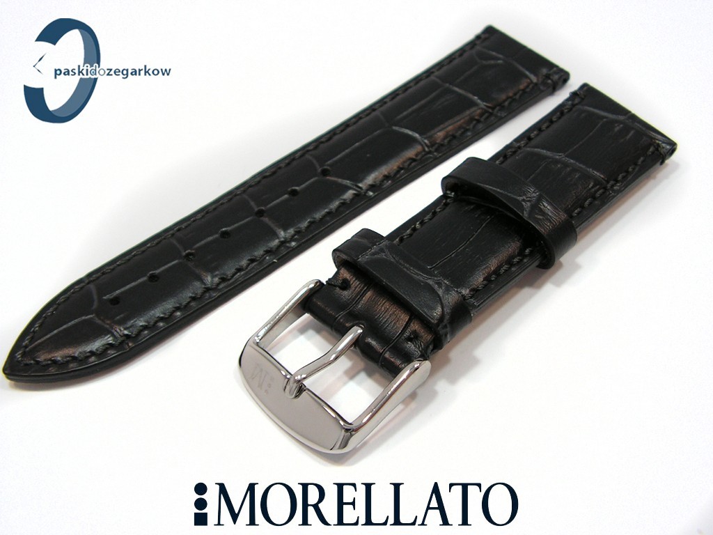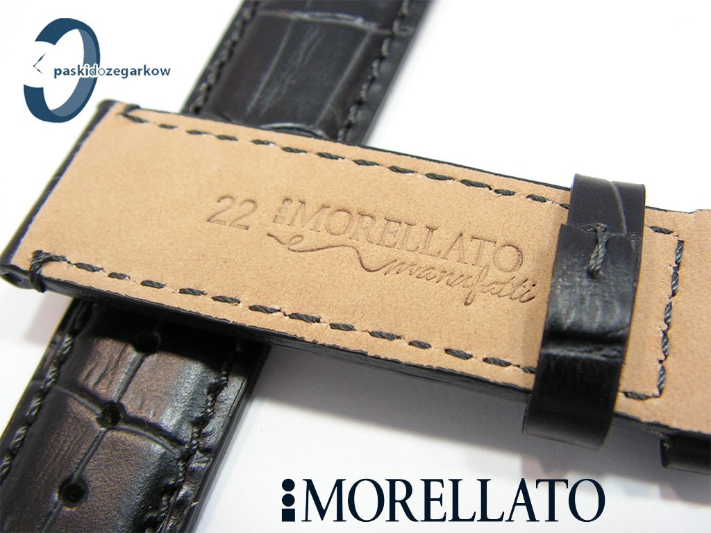Pasek do zegarka producenta MORELLATO - MODIGLIANI z kolekcji MANUFATTI skórzany, kolor czarny, przeszyty czarną nicią, na pasku tłoczony wzór aligatora, z lekkim połyskiem, sprzączka wykonana ze stali nierdzewnej, myszówka skórzana, szerokość paska 22 mm, zapinany na teleskopy.