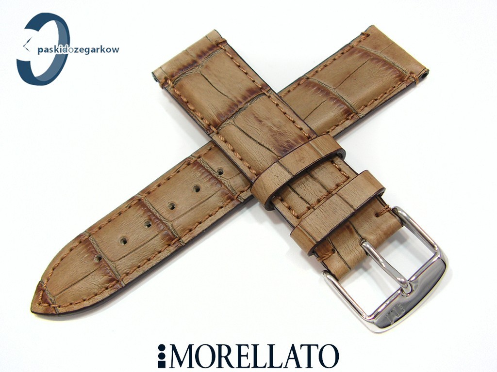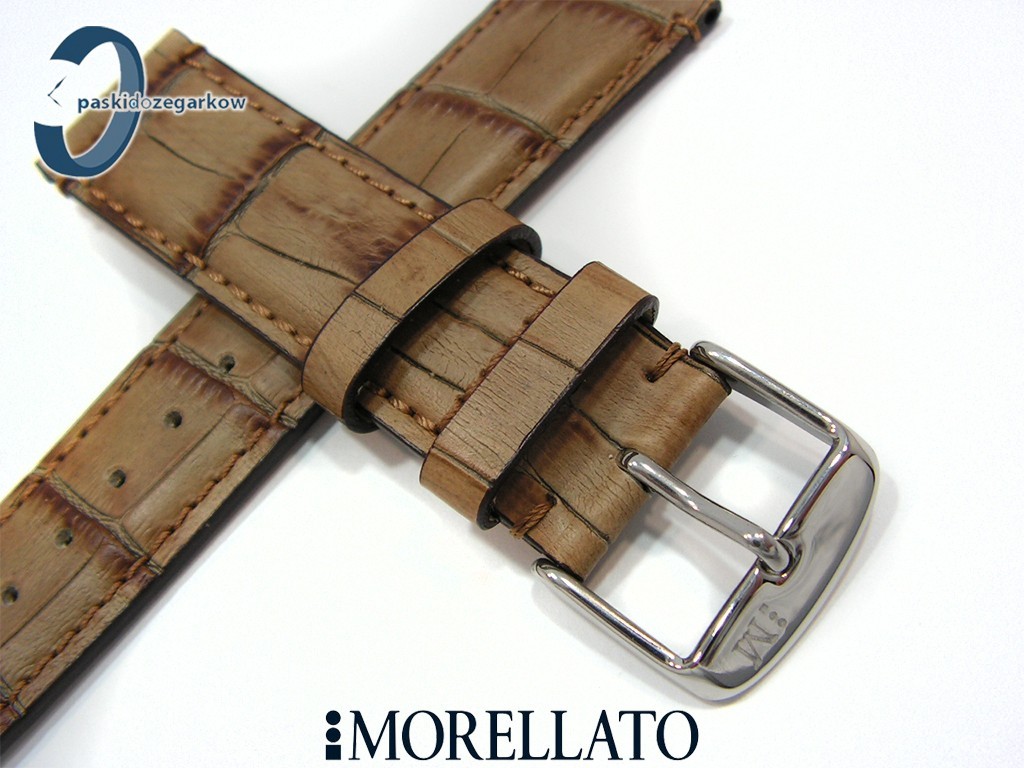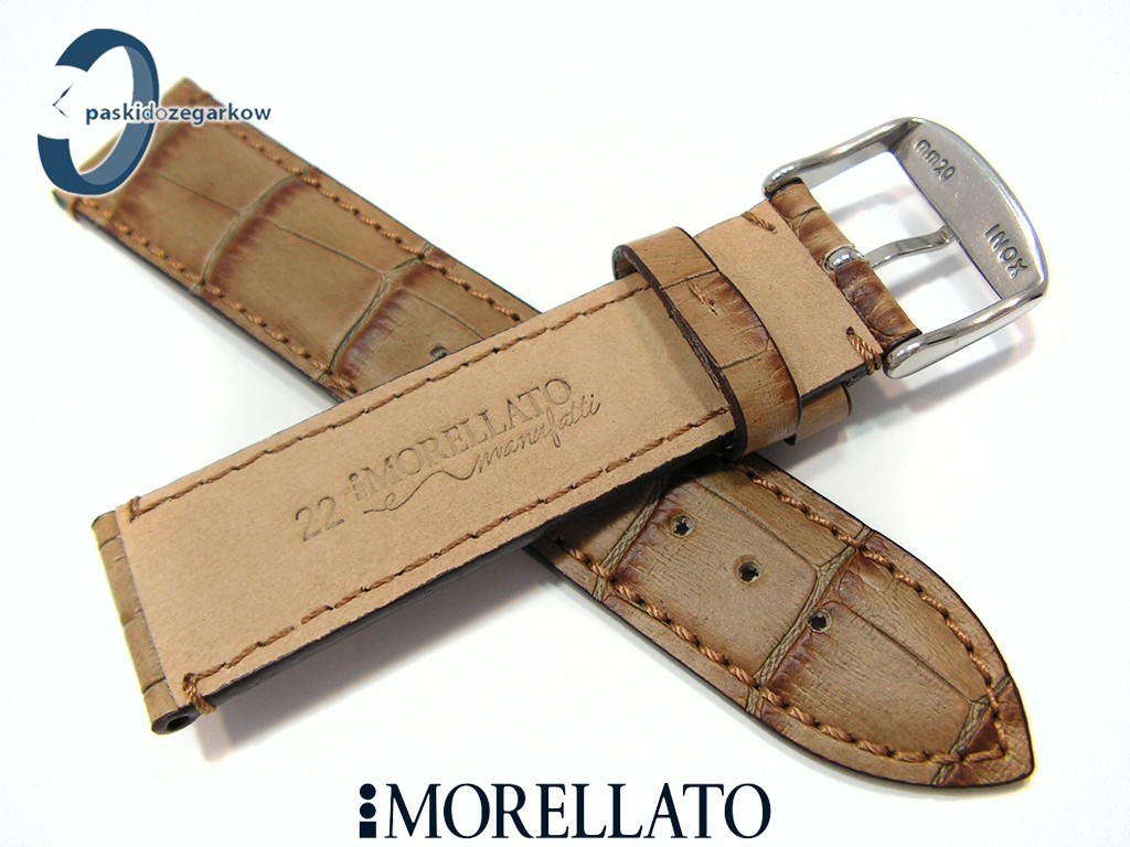 Pasek do zegarka producenta MORELLATO - MODIGLIANI Alligat. Vintage z kolekcji MANUFATTI skórzany, kolor jasny brąz, przeszyty brązową nicią, na pasku tłoczony wzór aligatora, z lekkim połyskiem, sprzączka wykonana ze stali nierdzewnej, myszówka skórzana, szerokość paska 22 mm, zapinany na teleskopy.