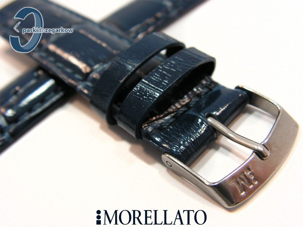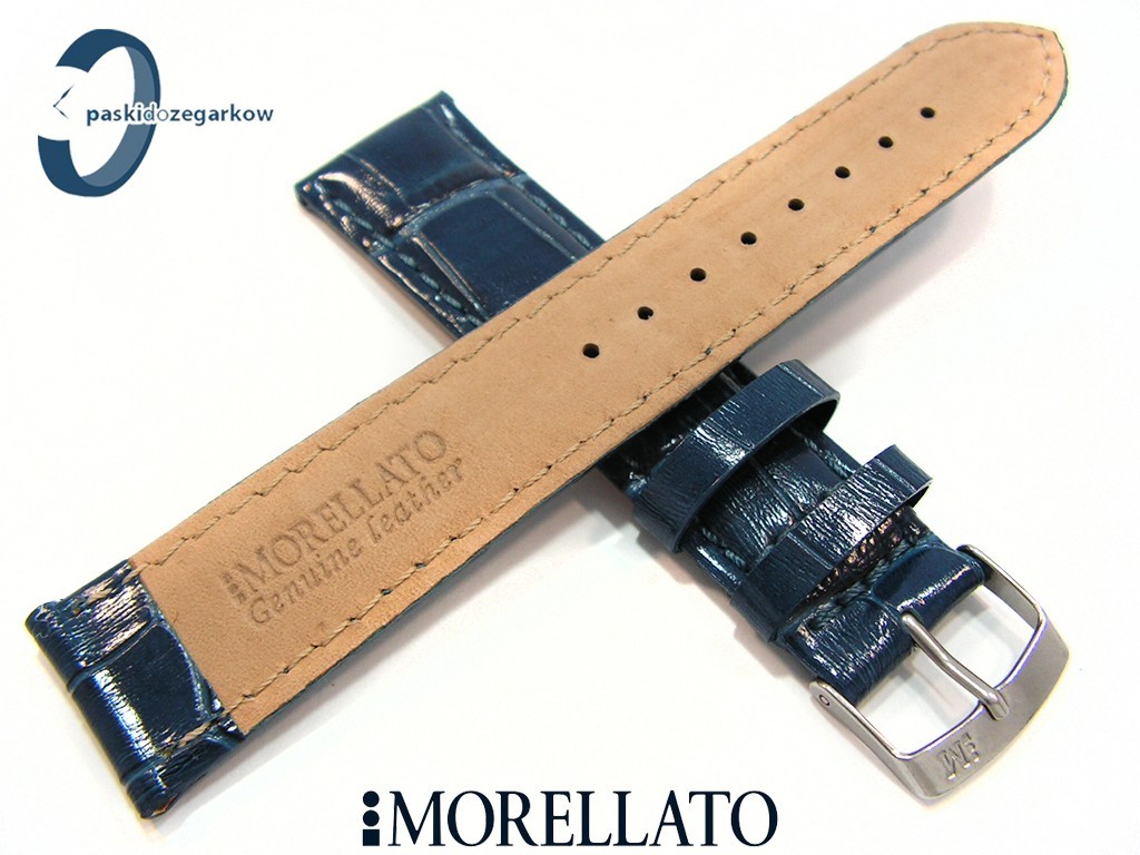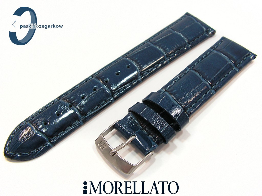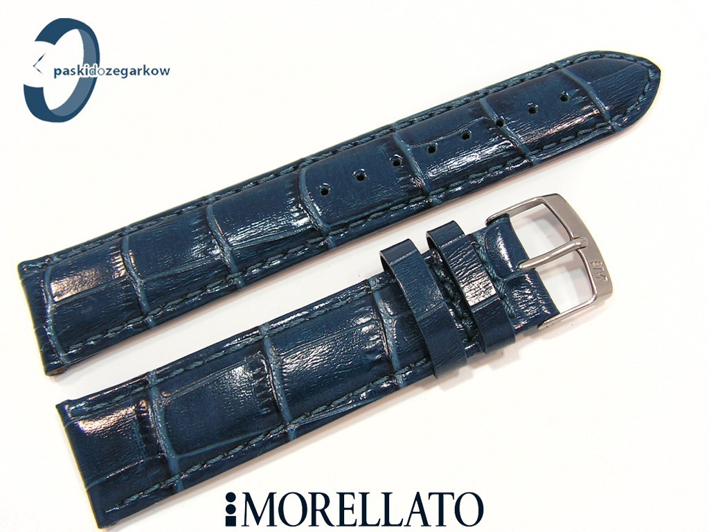 Pasek SAMBA od producenta MORELLATO skórzany, kolor niebieski, na pasku tłoczony wzór aligatora, z połyskiem, lekko wypełniany, przeszyty nicią w kolorze paska, sprzączka wykonana ze stali nierdzewnej, szerokość paska 22 mm, przy teleskopie szerokość 20 mm.