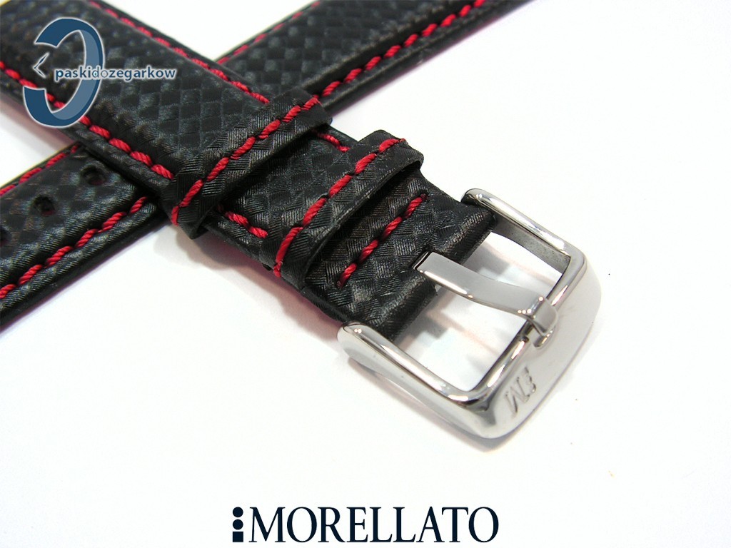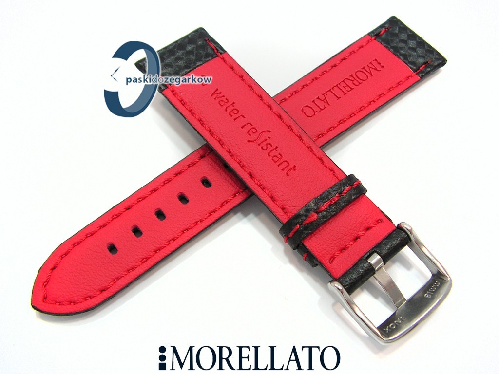 Pasek do zegarka BIKING producenta MORELLATO z kolekcji Sport skórzano-materiałowy w kolorze czarnym z czerwonym przeszyciem, myszówka w kolorze czerwonym, materiał z fakturą carbonu, sprzączka wykonana ze stali nierdzewnej, wodoodporny, szerokość paska 22 mm, przy sprzączce 20 mm.