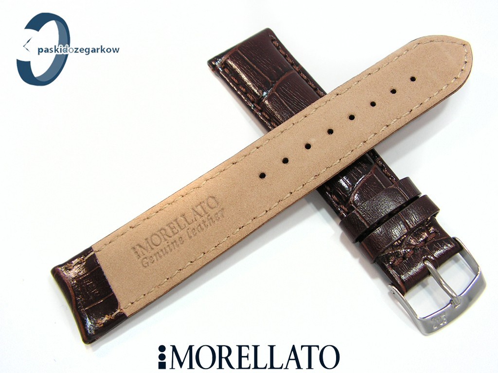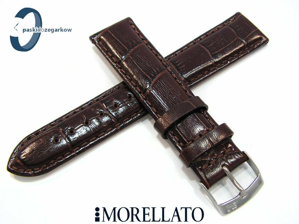 Pasek SAMBA od producenta MORELLATO skórzany, kolor ciemny brąz na pasku tłoczony wzór aligatora, z połyskiem, lekko wypełniany, przeszyty nicią w kolorze paska, sprzączka wykonana ze stali nierdzewnej, szerokość paska 22 mm, przy teleskopie szerokość 20 mm.