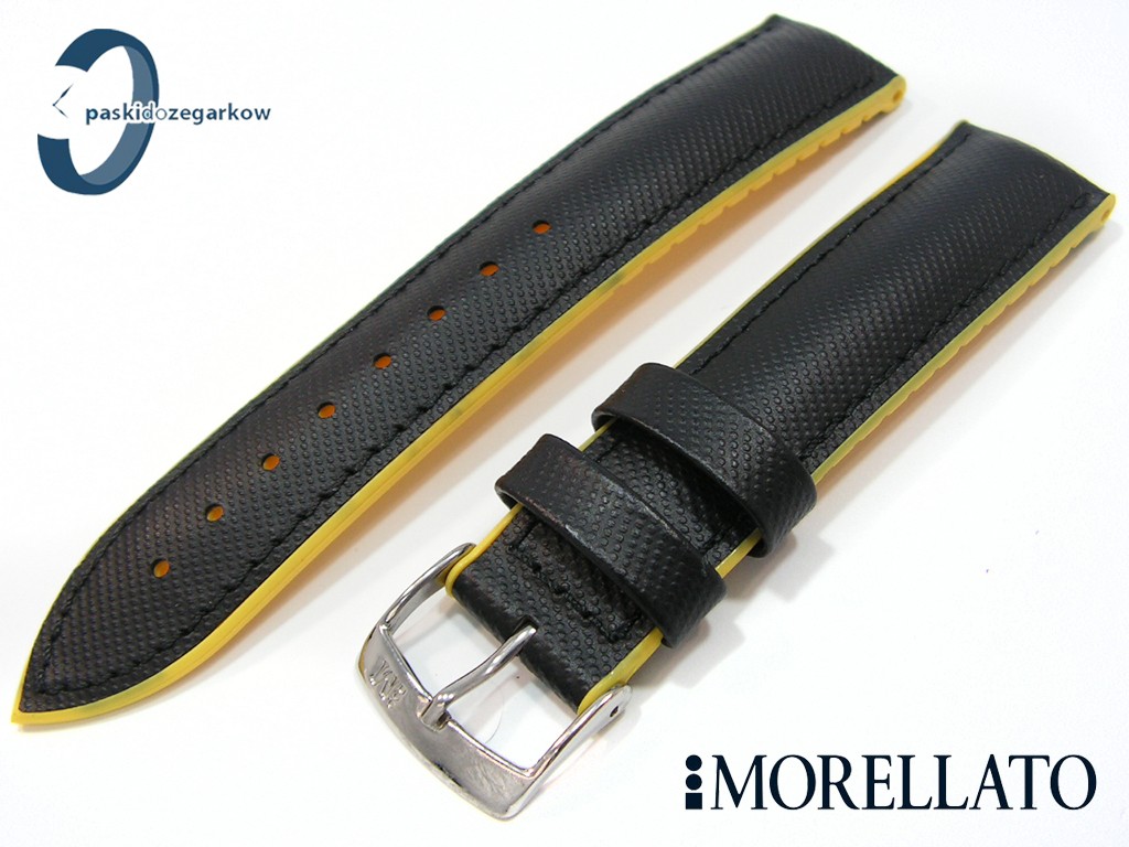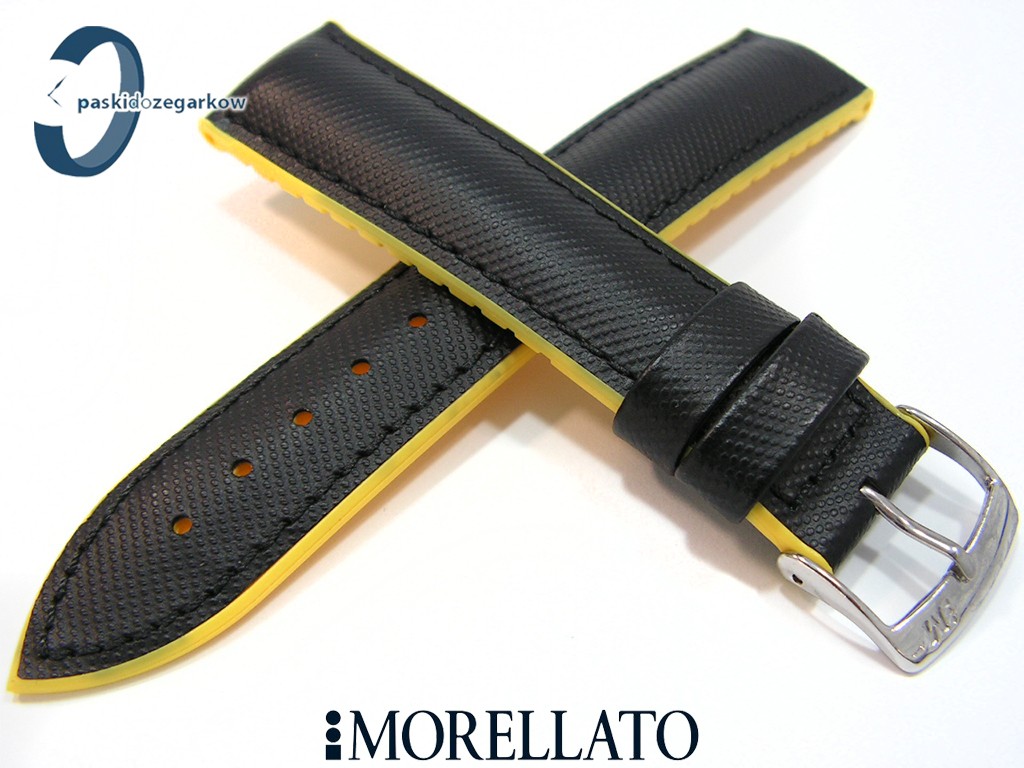 Pasek do zegarka od włoskiego producenta MORELLATO sportowy wykonany z wytrzymałego tworzywa w w kolorze czarnym, od spodu guma w kolorze żółtym, wodoodporny, wypełniany, przeszyty czarną nicią, sprzączka wykonana ze stali nierdzewnej w kolorze srebrnym, szerokość paska 22 mm, przy teleskopie 20 mm.