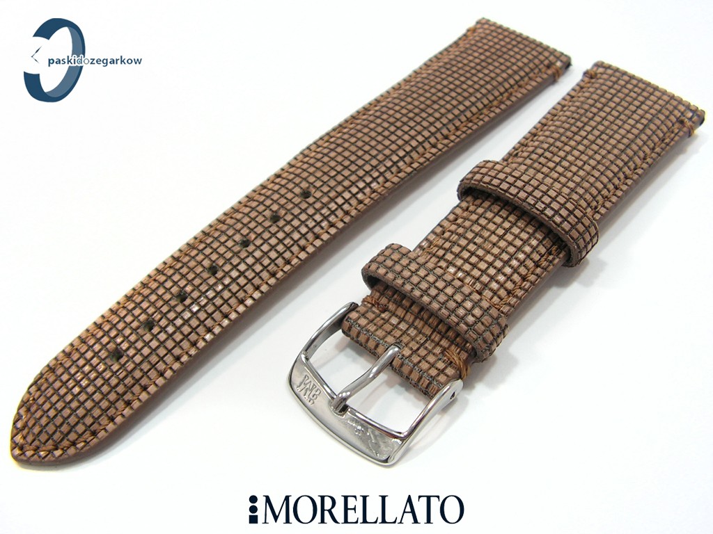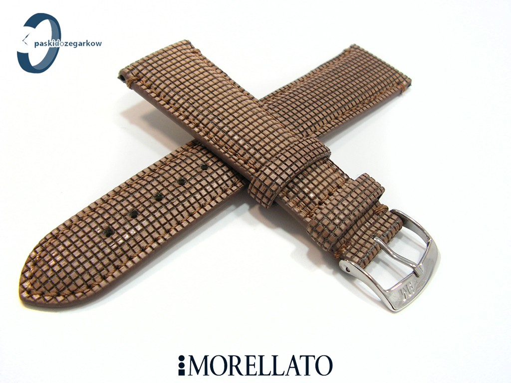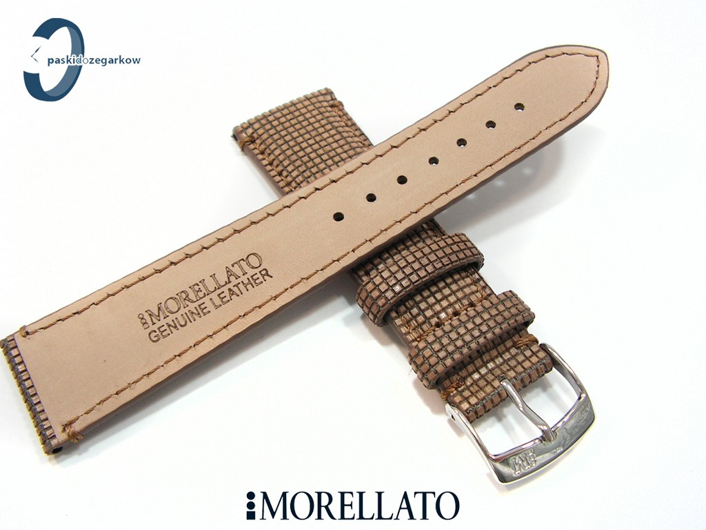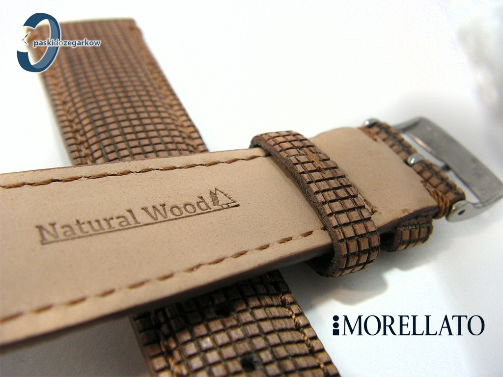 Pasek od włoskiego producenta Morellato z kolekcji Natural Wood wykonany ze skóry, poleczony kawałkami drewna, w kolorze jasny brąz, sprzączka wykonana ze stali nierdzewnej, lekko wypełniany, przeszyty, szerokość paska 22 mm, przy sprzączce 18 mm.