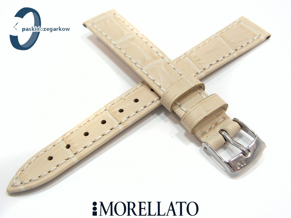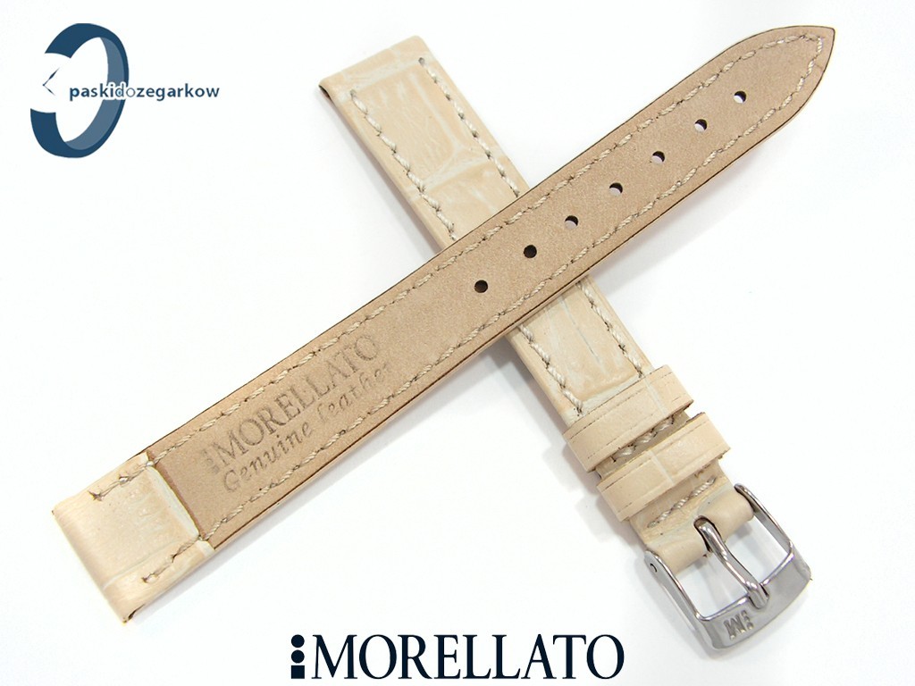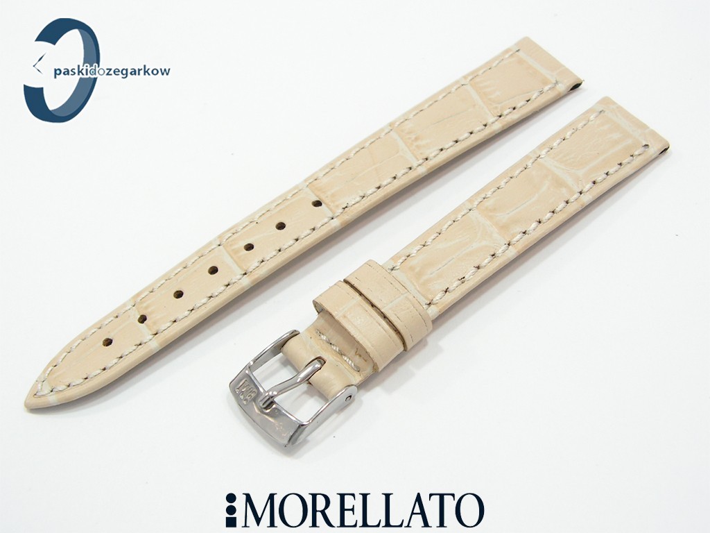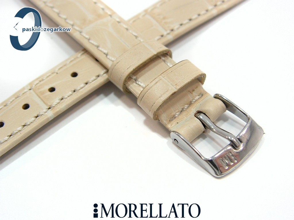 Pasek do zegarka od producenta MORELLATO skórzany w kolorze beżowym, na pasku tłoczony wzór aligatora, matowy, przeszyty nicią w kolorze paska, niewypełniany, sprzączka wykonana ze stali nierdzewnej, szerokość paska 14 mm, długość 120/80.