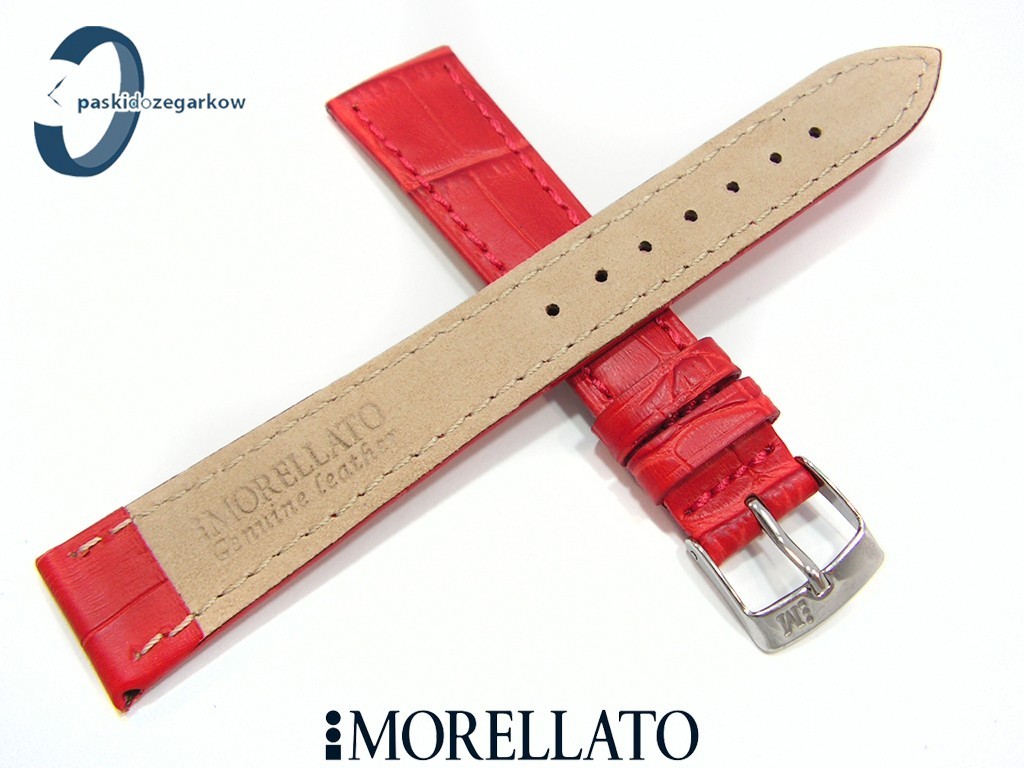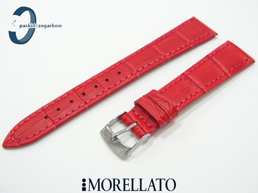 Pasek do zegarka od producenta MORELLATO skórzany w kolorze żywym czerwonym, na pasku tłoczony wzór aligatora, matowy, przeszyty nicią w kolorze paska, niewypełniany, sprzączka wykonana ze stali nierdzewnej, szerokość paska 16 mm, długość 120/80.