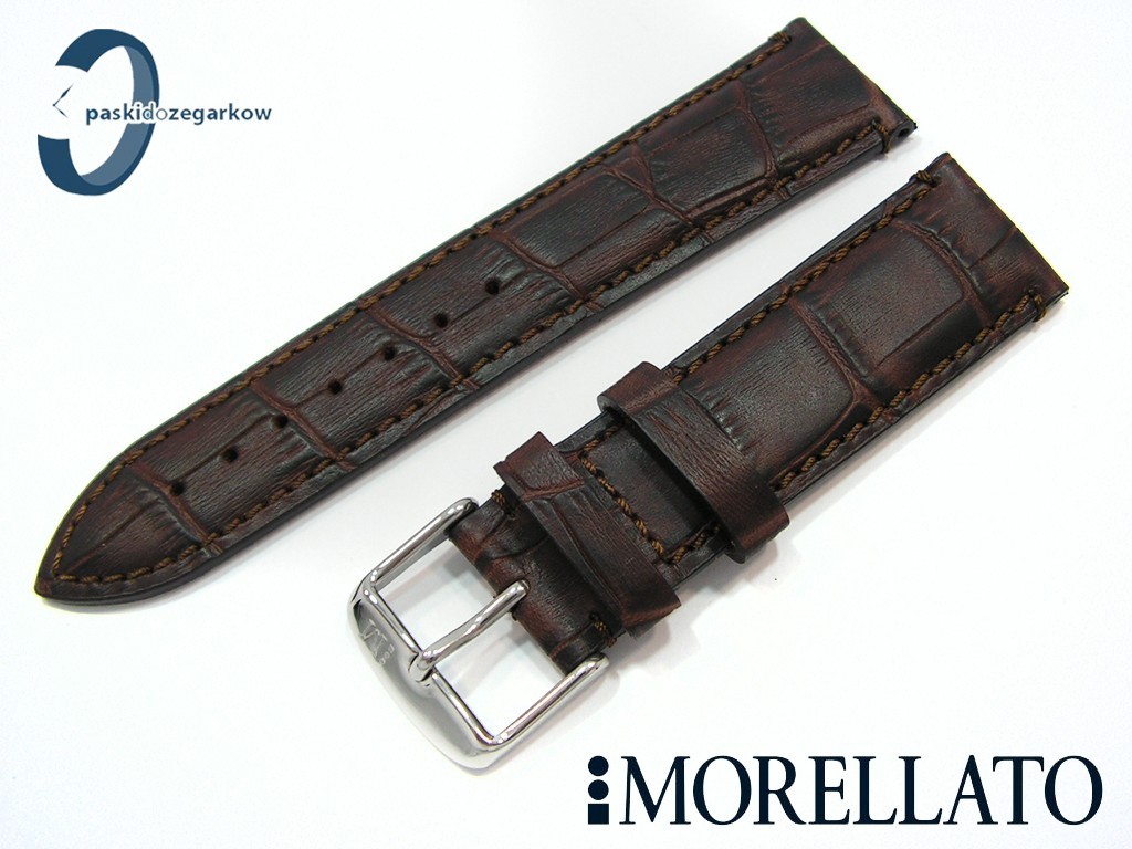 Pasek do zegarka producenta MORELLATO - MODIGLIANI Alligat. Vintage z kolekcji MANUFATTI skórzany, kolor ciemny brąz, przeszyty brązową nicią, na pasku tłoczony wzór aligatora, z lekkim połyskiem, sprzączka wykonana ze stali nierdzewnej, myszówka skórzana, szerokość paska 18 mm, zapinany na teleskopy.