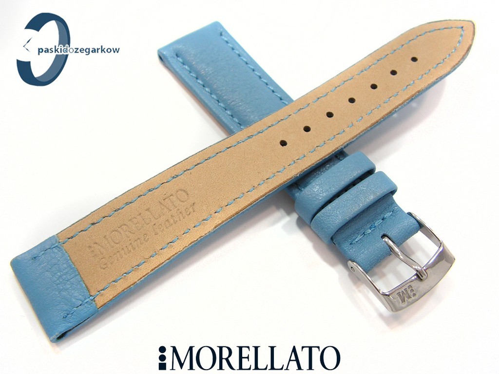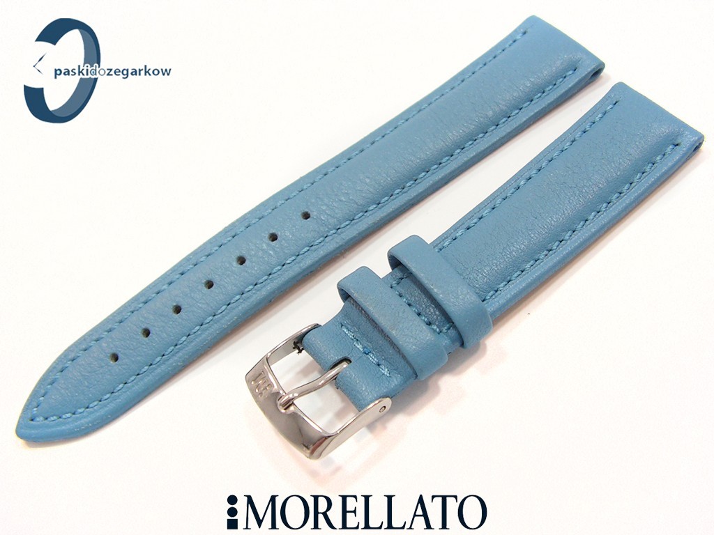 Pasek do zegarka MUSA od producenta MORELLATO skórzany w kolorze niebieski turkusowy, przeszyty, gładki, lekko wypełniany, matowy, szerokość paska 18 mm, przy sprzączce szerokść 16 mm, długość 120/74, sprzączka wykonana ze stali nierdzewnej.