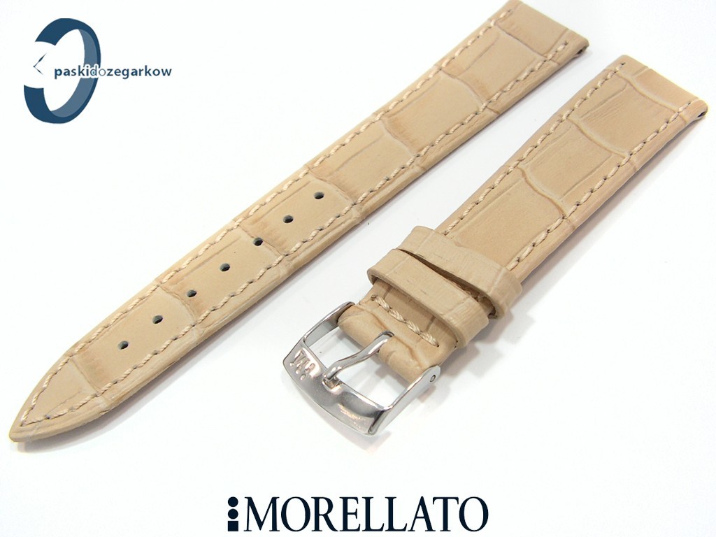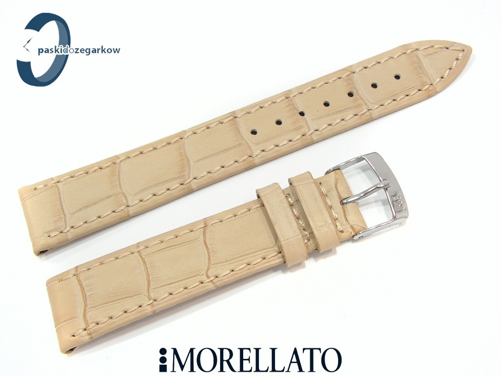 Pasek do zegarka od producenta MORELLATO skórzany w kolorze beżowym, na pasku tłoczony wzór aligatora, matowy, przeszyty nicią w kolorze paska, niewypełniany, sprzączka wykonana ze stali nierdzewnej, szerokość paska 18 mm, długość 120/80.