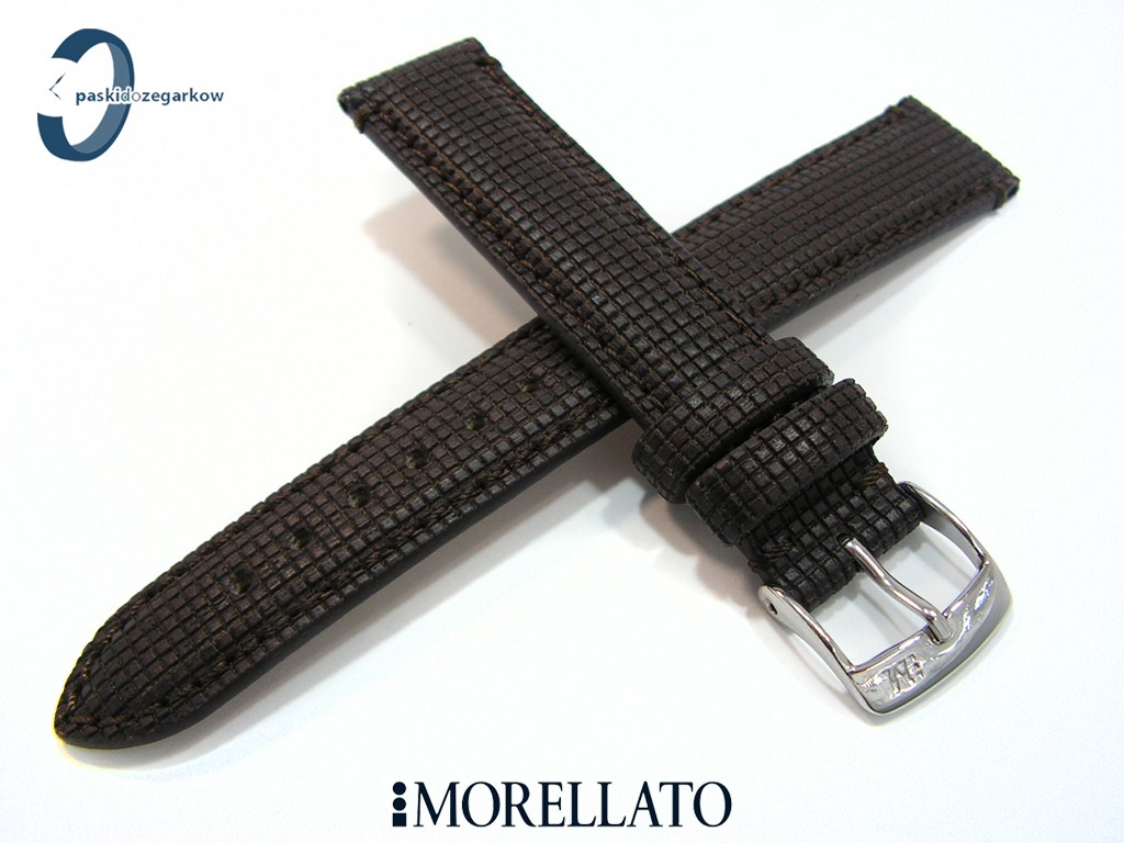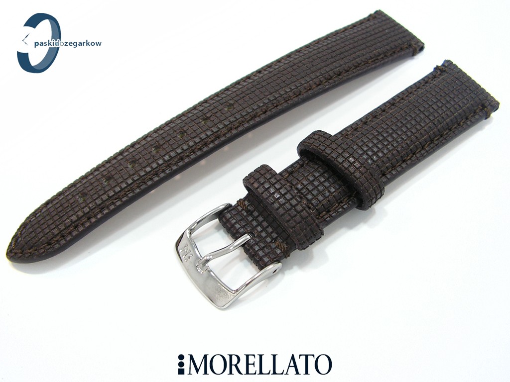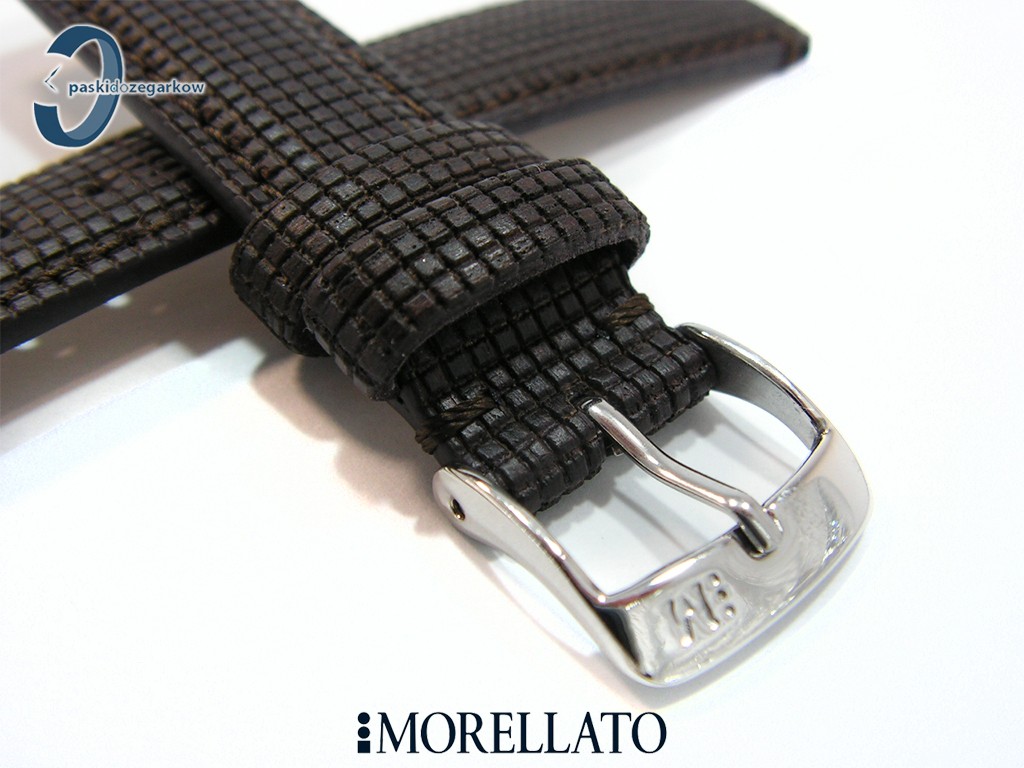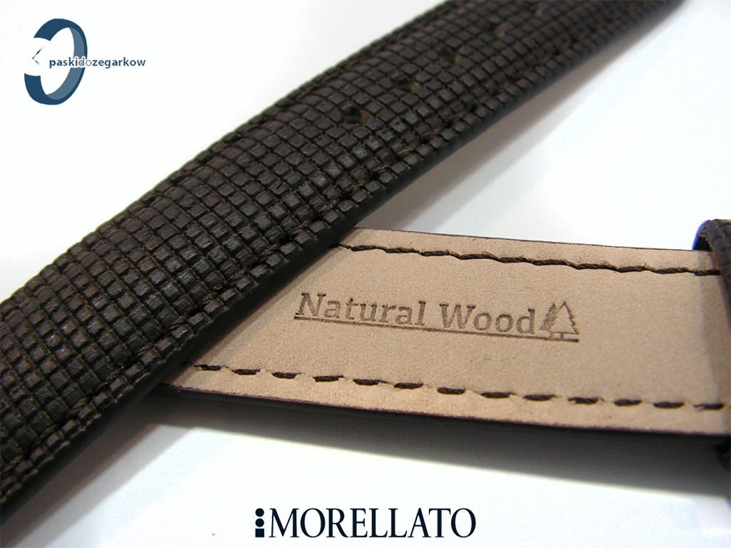 Pasek od prodcenta Morellato z kolekcji Natural Wood wykonany ze skóry, powleczony kawałkami prawdziwego drewna, w kolorze ciemny brąz, przeszyty, lekko wypełniany, sprzączka wykonana ze stali nierdzewnej, szerokość paska 18 mm, przy sprzączce 16 mm.
