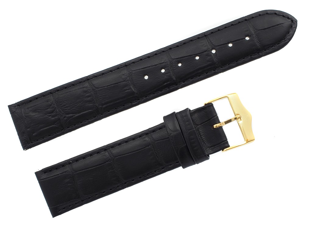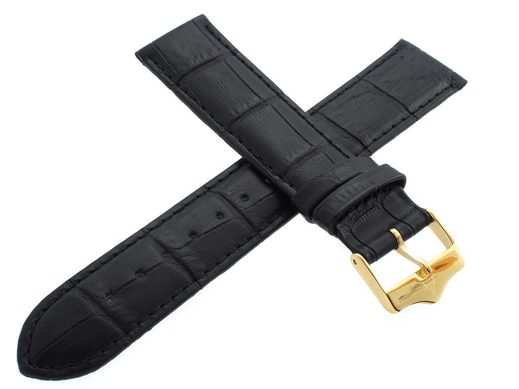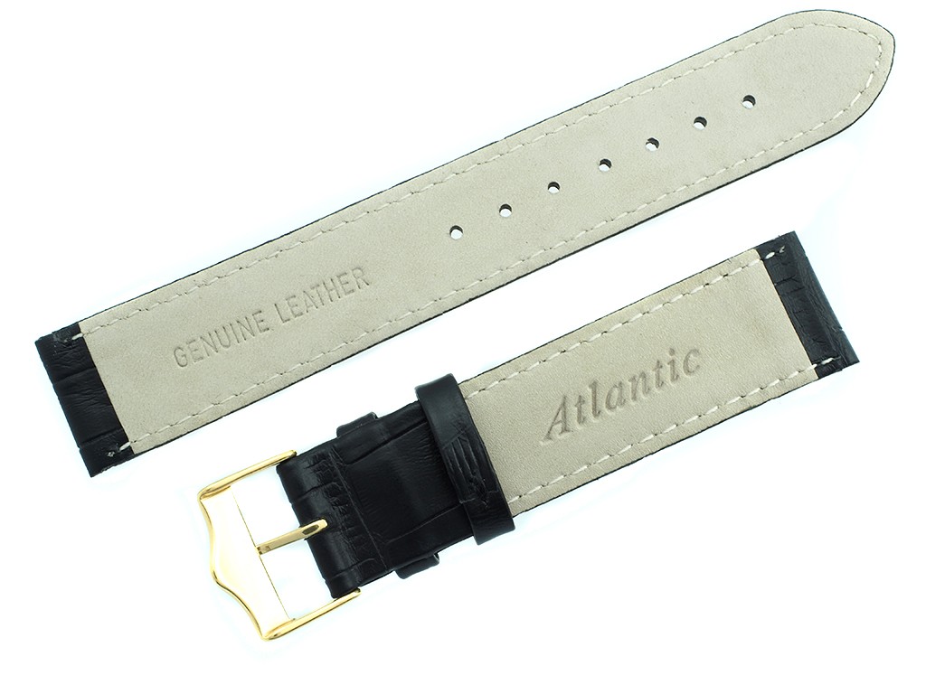 Oryginalny pasek producenta Atlantic w rozmiarze 19 mm, wykonany ze skóry naturalnej w kolorze czarnym, na pasku tłoczony wzór aligatora, przeszyty, sprzączka wykonana ze stali nierdzewnej w kolorze złotym, z wybitym logo Atlantic.