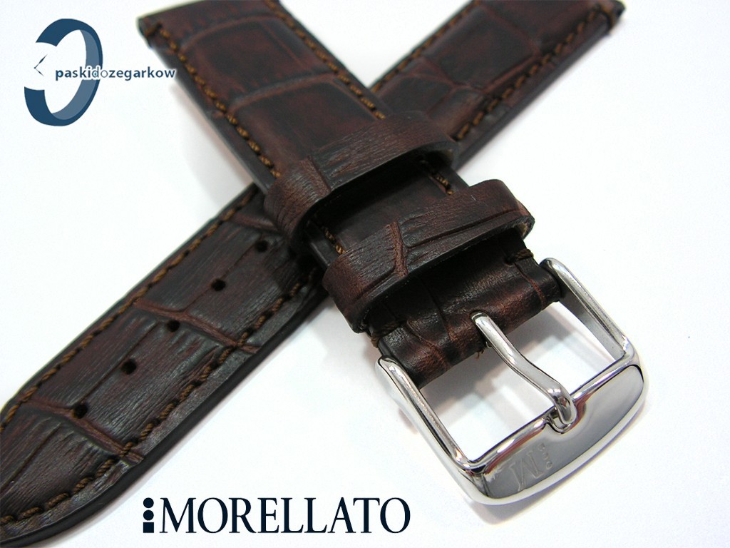 Pasek do zegarka producenta MORELLATO - MODIGLIANI Alligat. Vintage z kolekcji MANUFATTI skórzany, kolor ciemny brąz, przeszyty brązową nicią, na pasku tłoczony wzór aligatora, z lekkim połyskiem, sprzączka wykonana ze stali nierdzewnej, myszówka skórzana, szerokość paska 20 mm, zapinany na teleskopy.