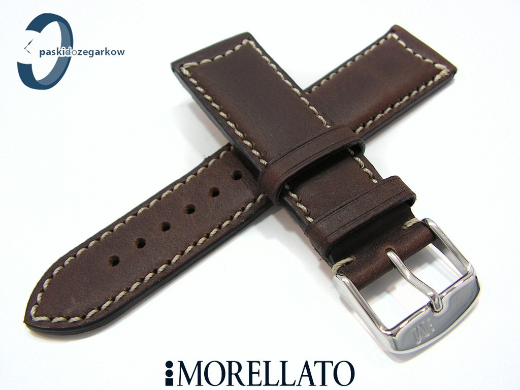 Pasek skórzany do zegarka MORELLATO CEZANNE z kolekcji MANUFATTI wykonany z wysokiej jakości skóry, w kolorze ciemny brąz, boki paska czarne, gładki, matowy, przeszyty jasną nicią, sprzączka wykonana ze stali nierdzewnej, szerokość paska 22 mm zwężany do 18 mm.