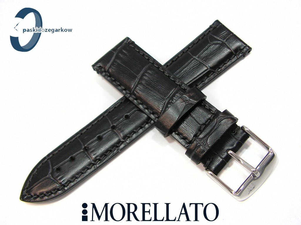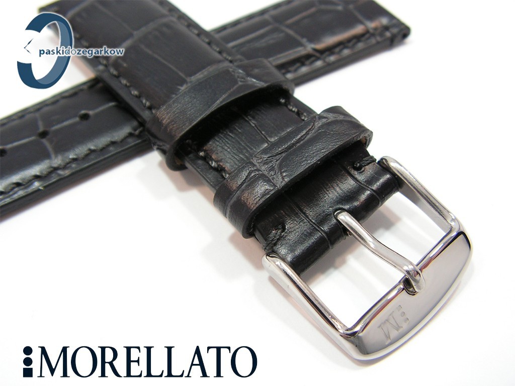 Pasek do zegarka producenta MORELLATO - MODIGLIANI z kolekcji MANUFATTI skórzany, kolor czarny, przeszyty czarną nicią, na pasku tłoczony wzór aligatora, z lekkim połyskiem, sprzączka wykonana ze stali nierdzewnej, myszówka skórzana, szerokość paska 18 mm, zapinany na teleskopy.