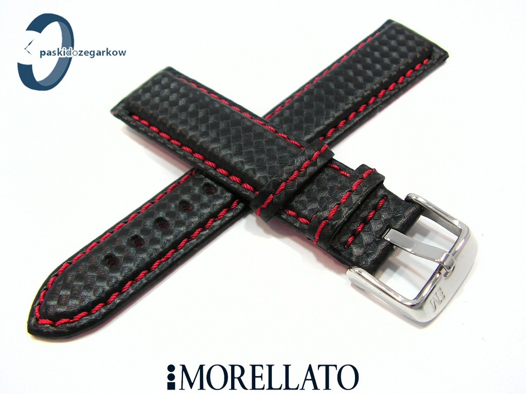 Pasek do zegarka BIKING producenta MORELLATO z kolekcji Sport skórzano-materiałowy w kolorze czarnym z czerwonym przeszyciem, myszówka w kolorze czerwonym, materiał z fakturą carbonu, sprzączka wykonana ze stali nierdzewnej, wodoodporny, szerokość paska 20 mm, przy sprzączce 18 mm.