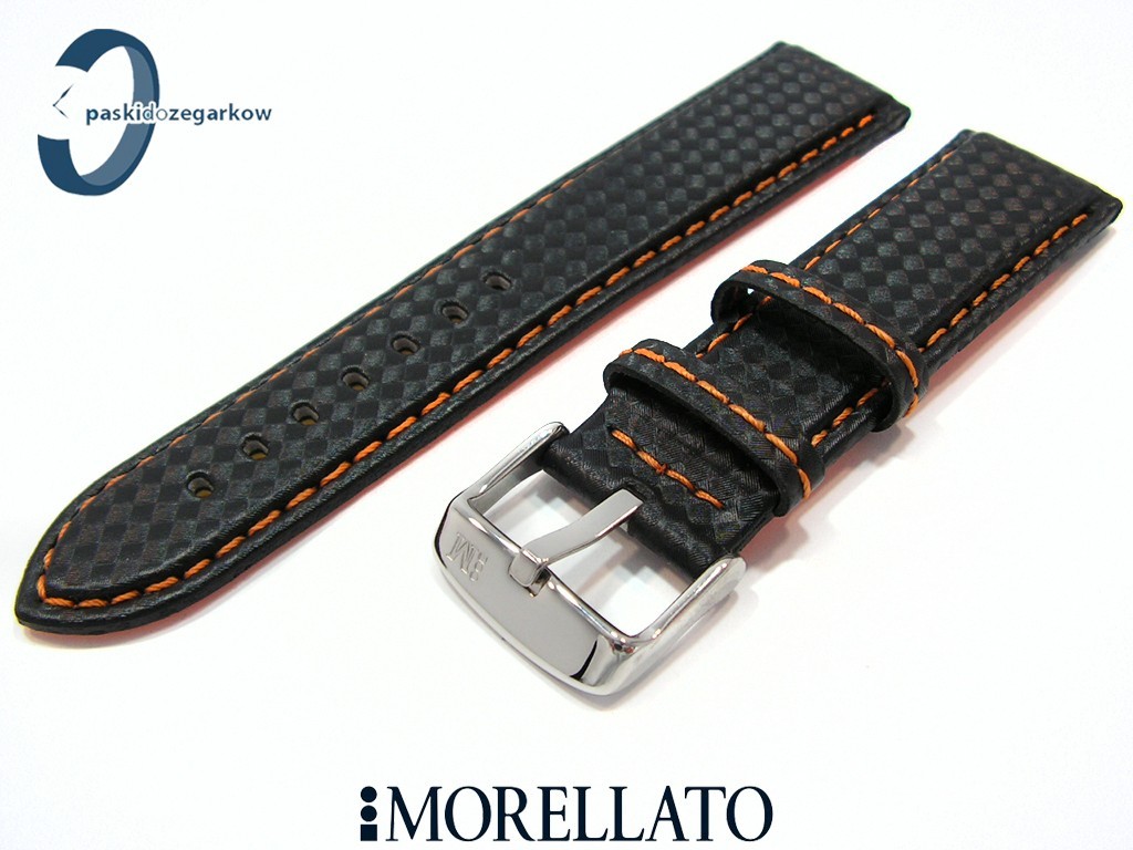 Pasek do zegarka BIKING producenta MORELLATO z kolekcji Sport skórzano-materiałowy w kolorze czarnym z pomaranczowym przeszyciem, myszówka w kolorze pomarańczowym, materiał z fakturą carbonu, sprzączka wykonana ze stali nierdzewnej, wodoodporny, szerokość paska 20 mm.