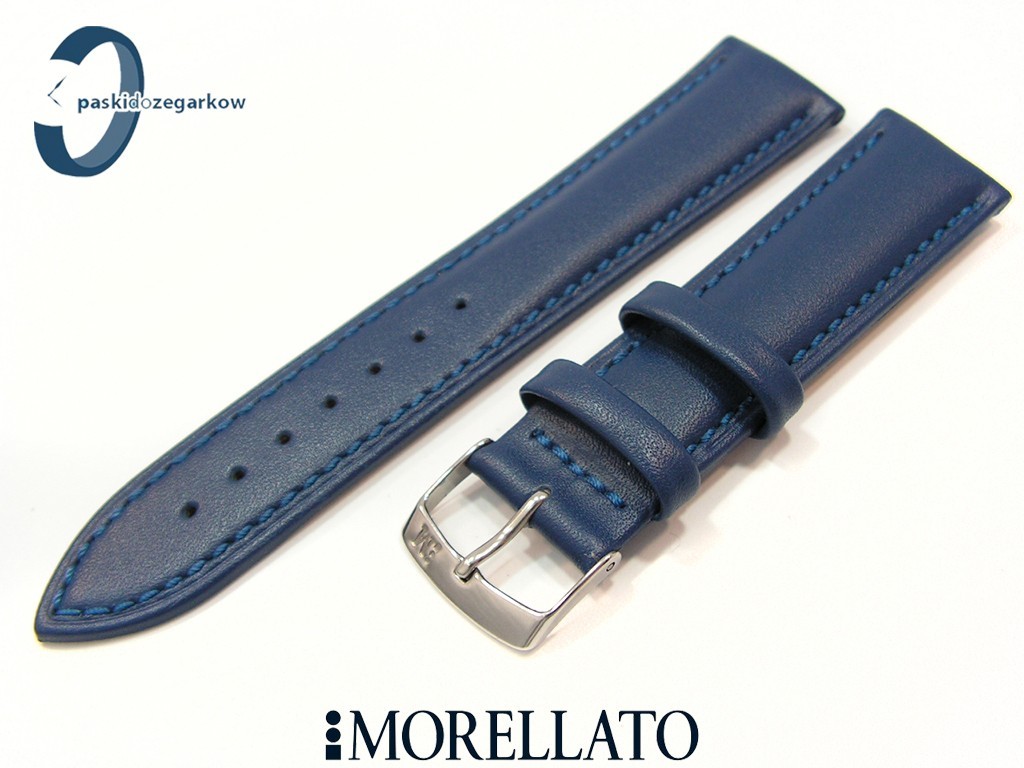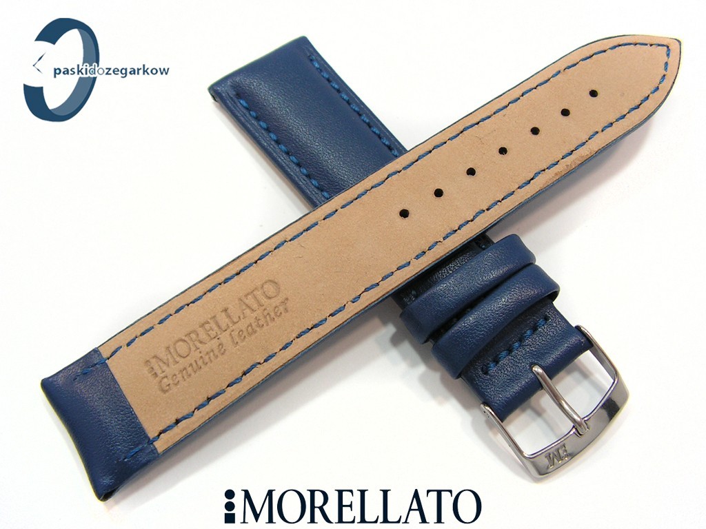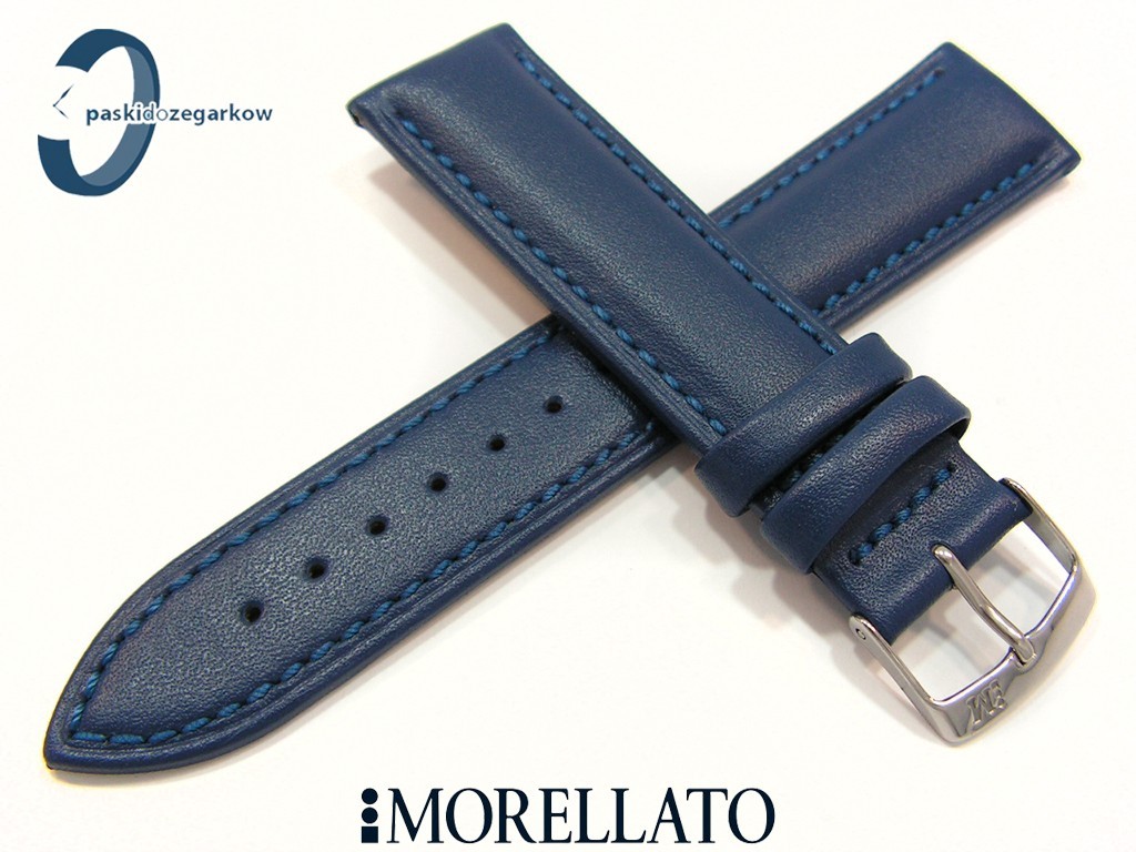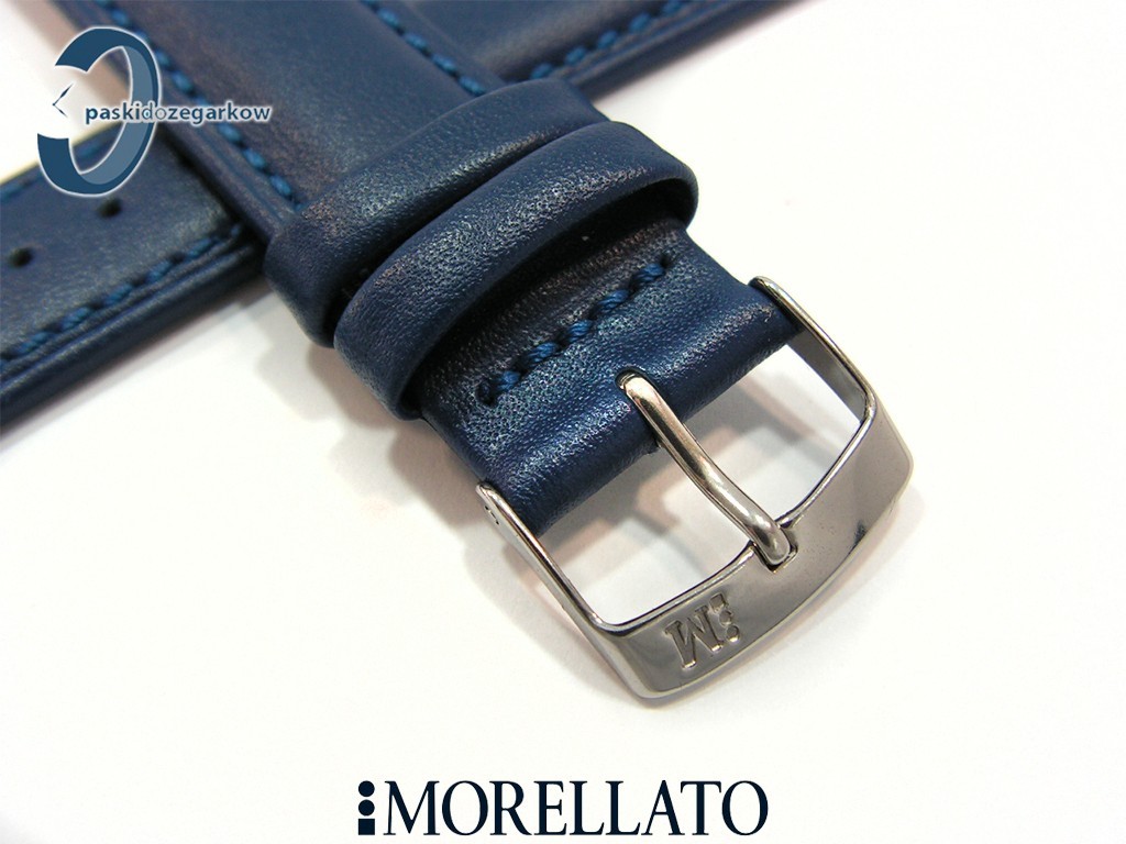 Pasek MUSA od producenta MORELLATO skórzany w kolorze granatowym, przeszyty niebieską nicią, gładki, sprzączka wykonana ze stali nierdzewnej, szerokość paska 20 mm, przy sprzączce 18 mm.