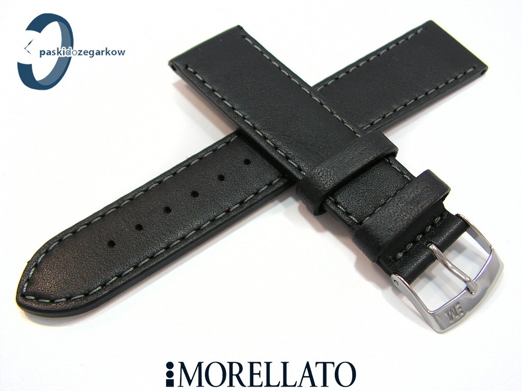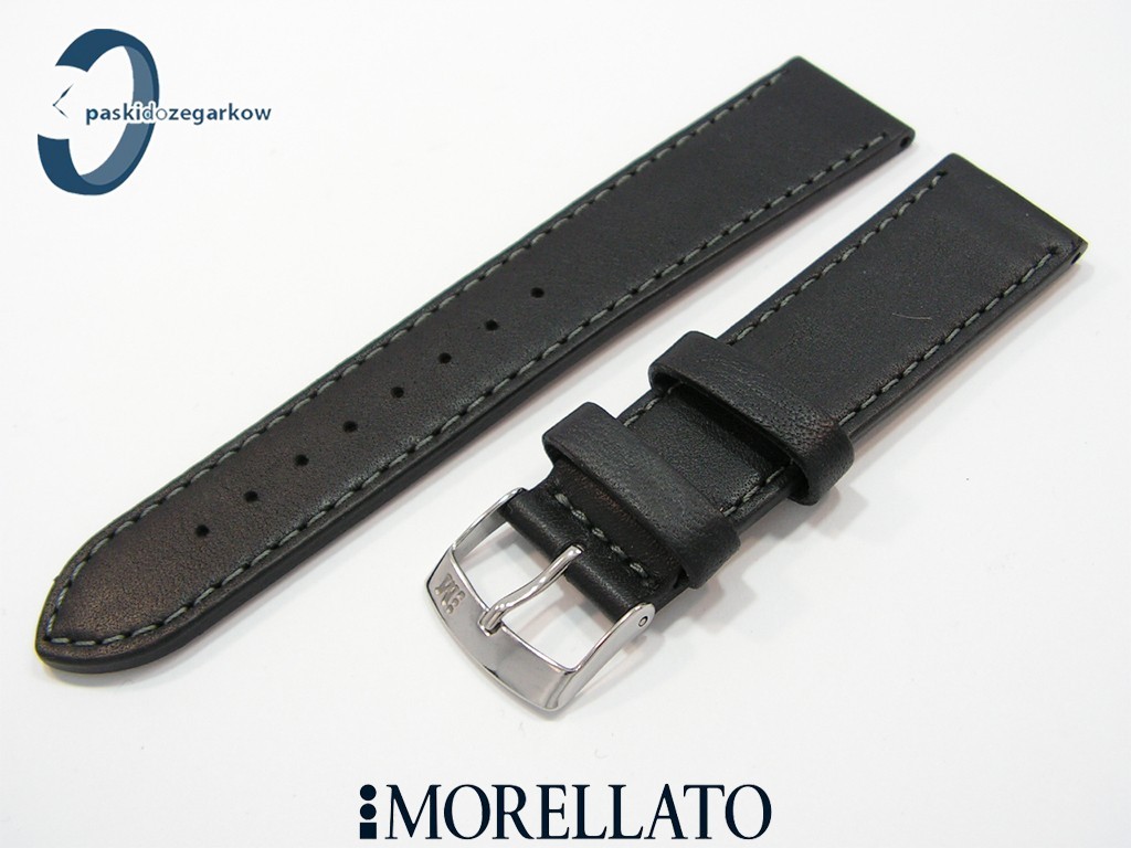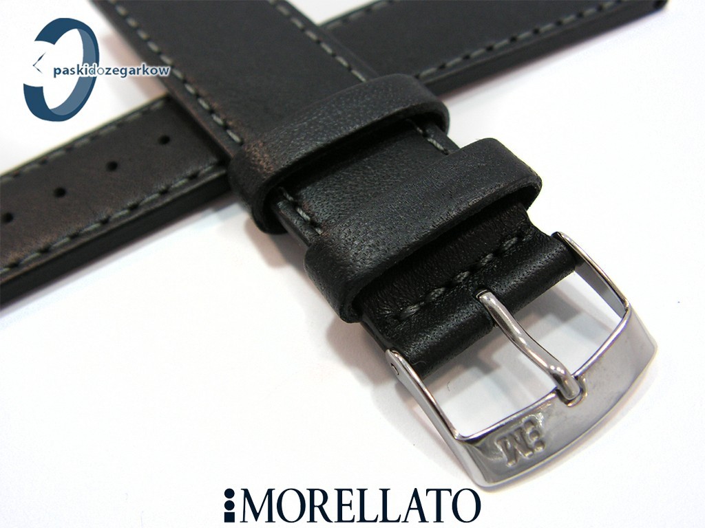 Pasek do zegarka DELTA od producnta MORELLATO wykonany ze skóry w kolorze czarnym, gładki,niewypełniany, przeszyty cienką szarą nicią, sprzączka wykonana ze stali nierdzewnej, szerokość paska 20 mm, przy sprzączce 18 mm, długość 106/71.