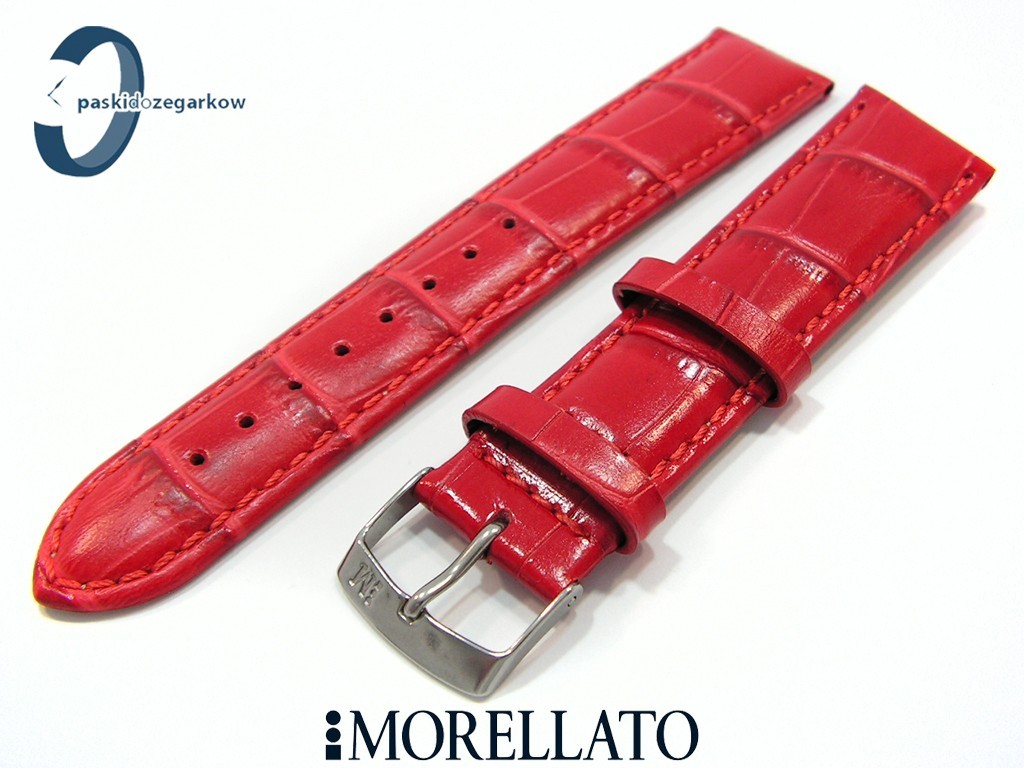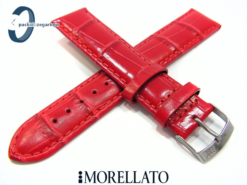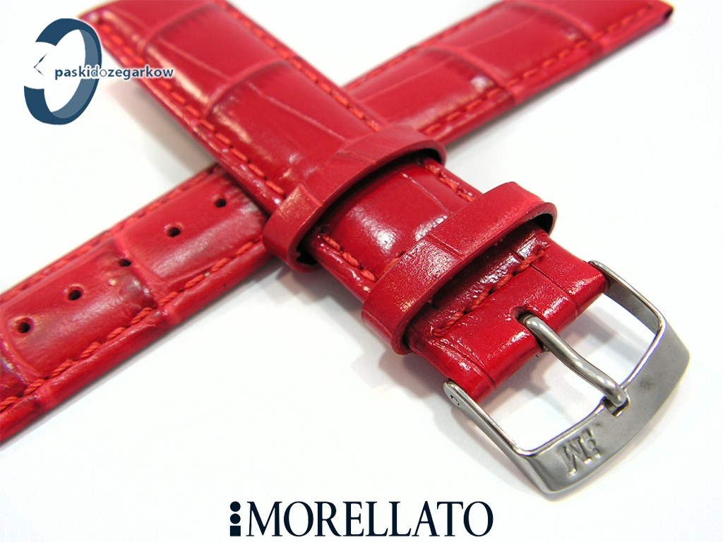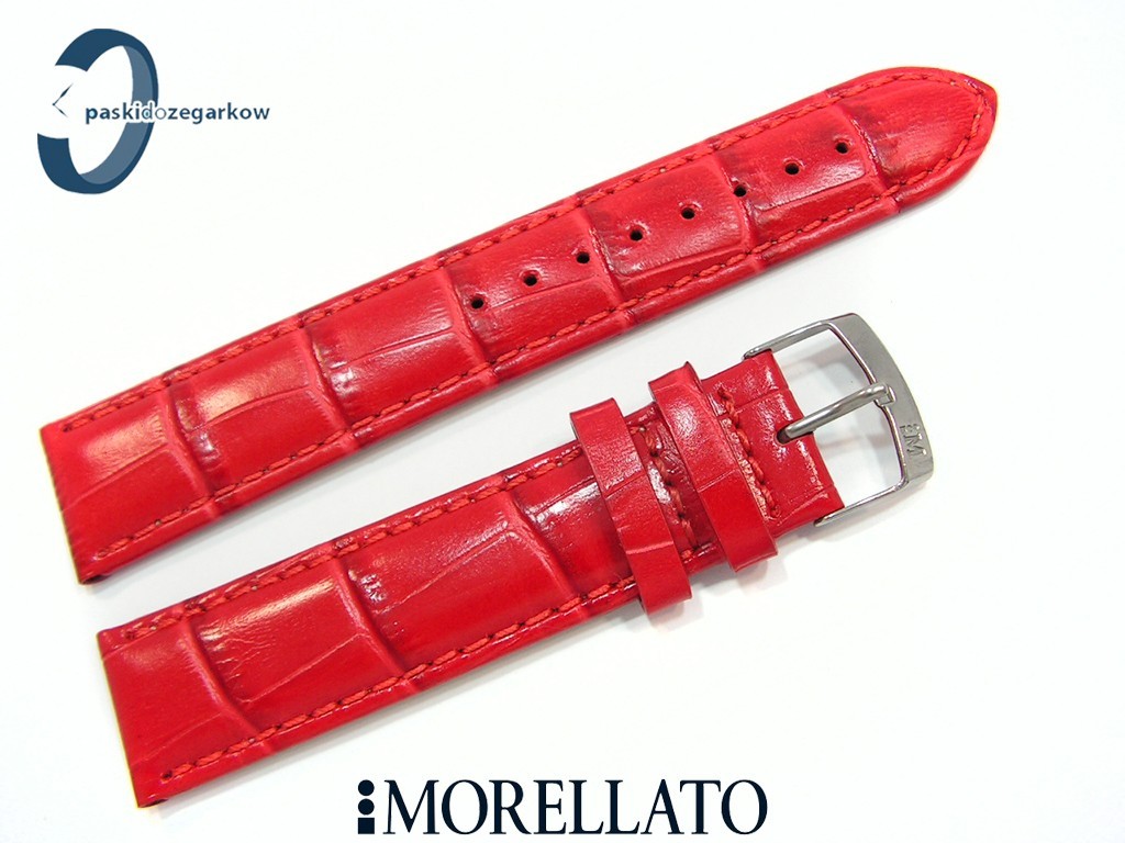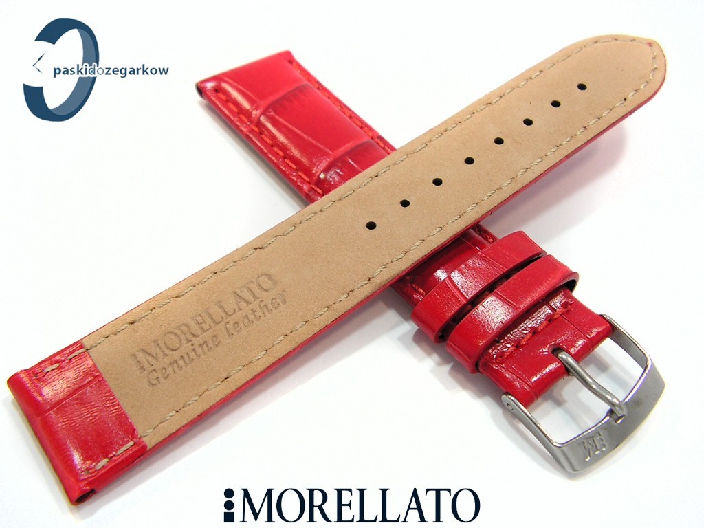 Pasek SAMBA od producenta MORELLATO skórzany, kolor czarwony, na pasku tłoczony wzór aligatora, z połyskiem, lekko wypełniany, przeszyty nicią w kolorze paska, sprzączka wykonana ze stali nierdzewnej, szerokość paska 20 mm, przy teleskopie szerokość 18 mm.