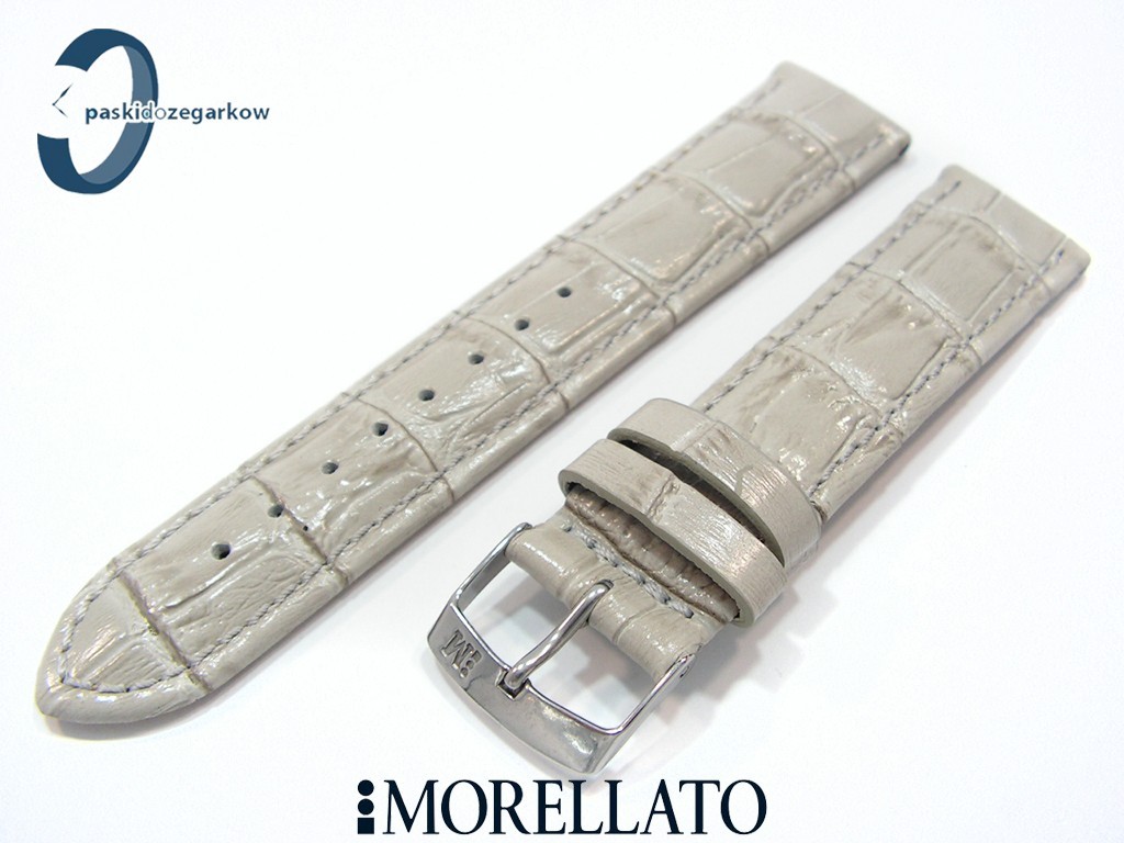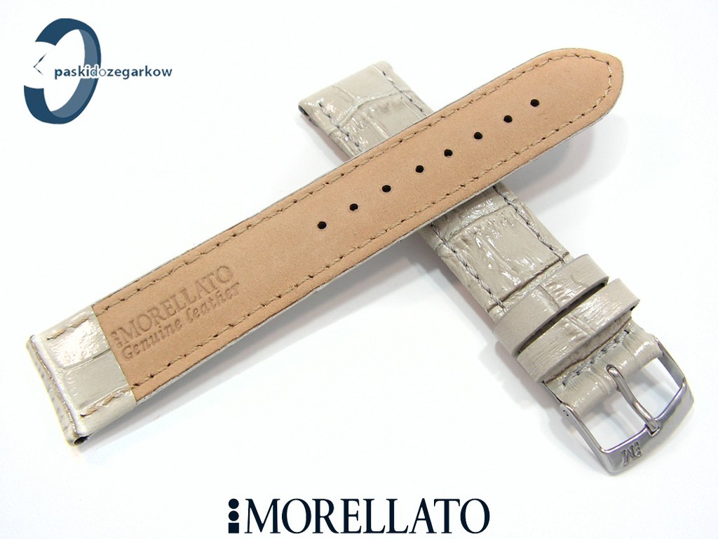 Pasek SAMBA od producenta MORELLATO skórzany, kolor szary, na pasku tłoczony wzór aligatora, z połyskiem, lekko wypełniany, przeszyty nicią w kolorze paska, sprzączka wykonana ze stali nierdzewnej, szerokość paska 20 mm, przy teleskopie szerokość 18 mm.