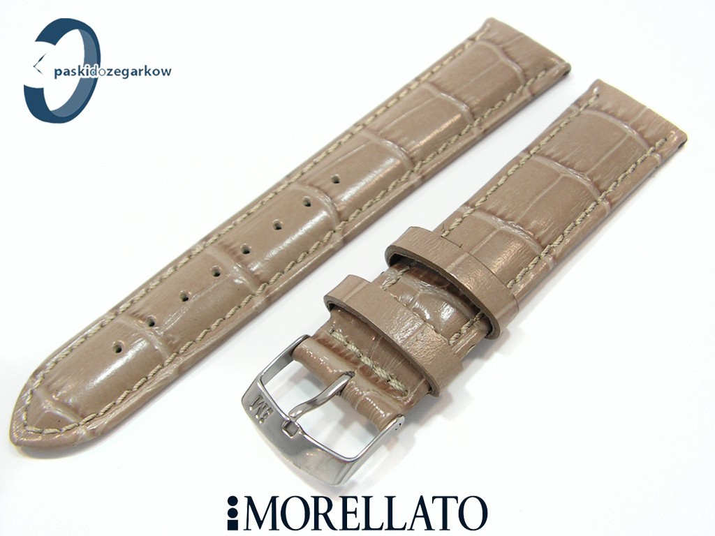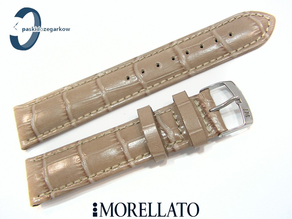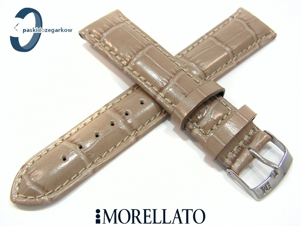 Pasek SAMBA od producenta MORELLATO skórzany, kolor beżowy, na pasku tłoczony wzór aligatora, z połyskiem, lekko wypełniany, przeszyty nicią w kolorze paska, sprzączka wykonana ze stali nierdzewnej, szerokość paska 20 mm, przy teleskopie szerokość 18 mm.