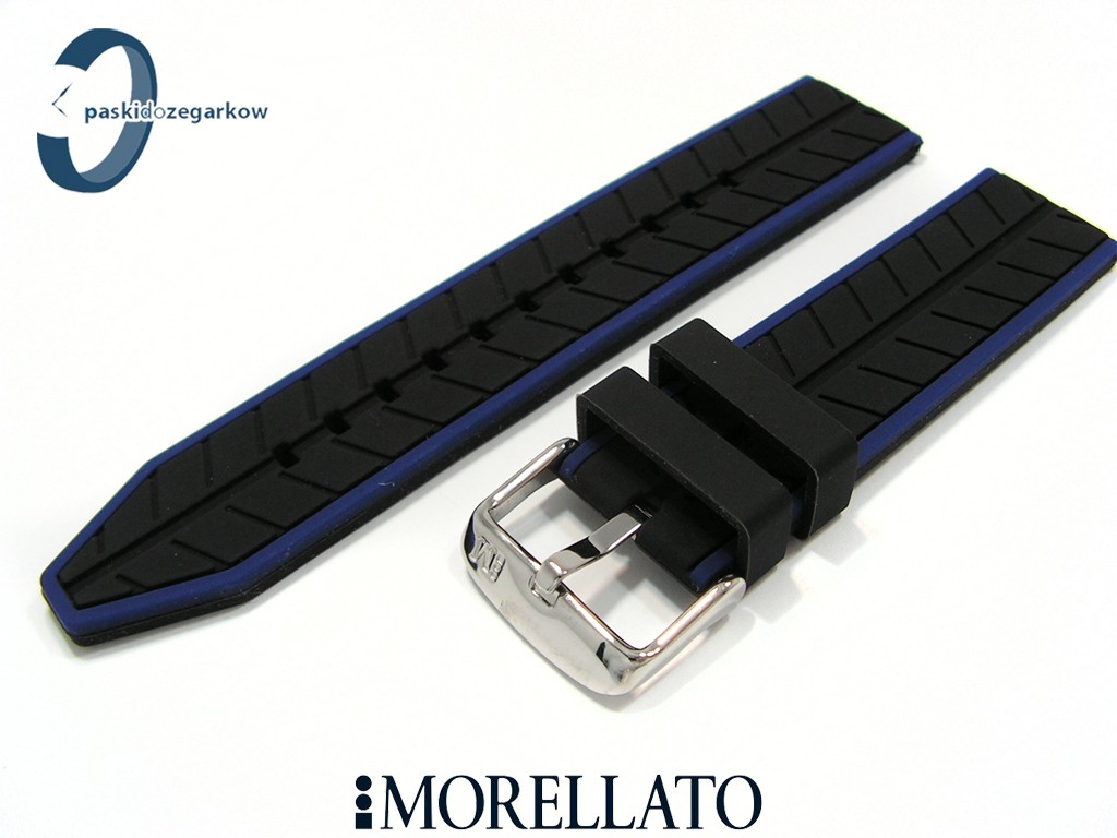 Pasek od włoskiego producenta Morellato wykonany z dobrej jakości silikonu w kolorze czarnym, na pasku wytłoczony  oryginalny wzór przypominający bieżnik opony, boki paska w kolorze niebieskim, sprzączka wykonana ze stali nierdzewnej  w kolorze srebrnym, szerokość paska 20 mm, pasuje do zegarków z rozmiarem koperty 20 mm.