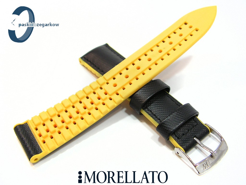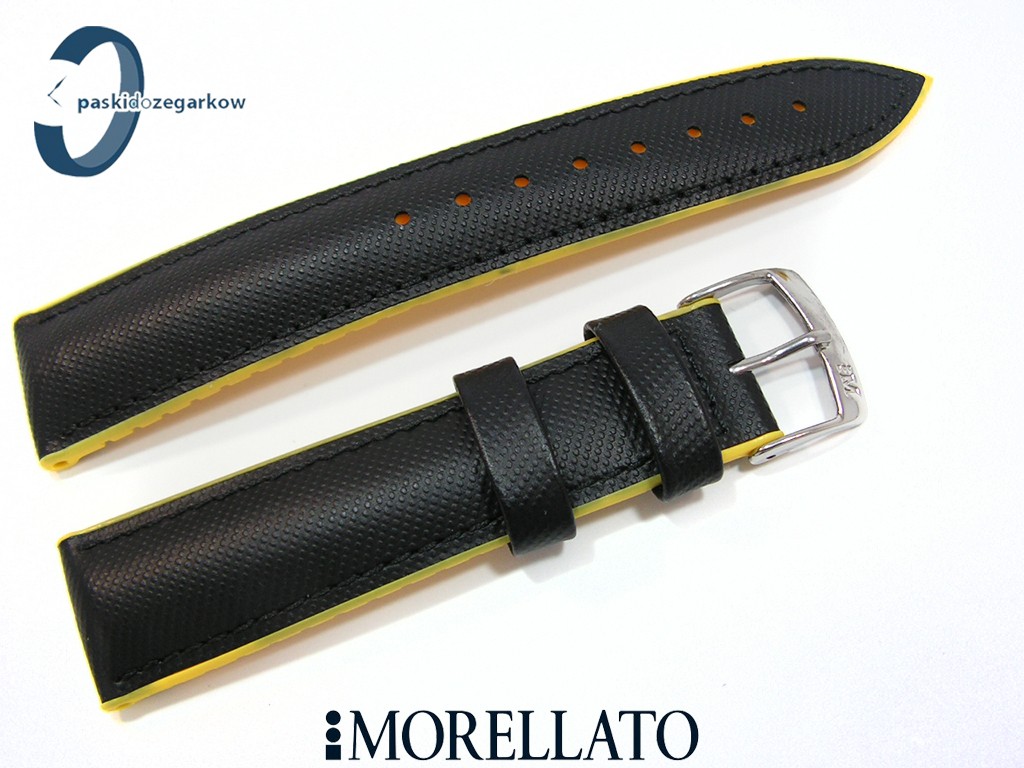 Pasek do zegarka od włoskiego producenta MORELLATO sportowy wykonany z wytrzymałego tworzywa w w kolorze czarnym, od spodu guma w kolorze żółtym, wodoodporny, wypełniany, przeszyty czarną nicią, sprzączka wykonana ze stali nierdzewnej w kolorze srebrnym, szerokość paska 20 mm, przy teleskopie 18 mm.