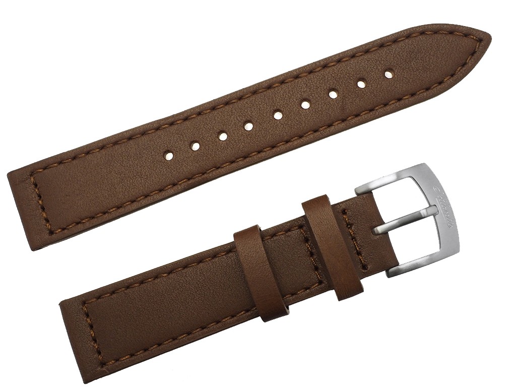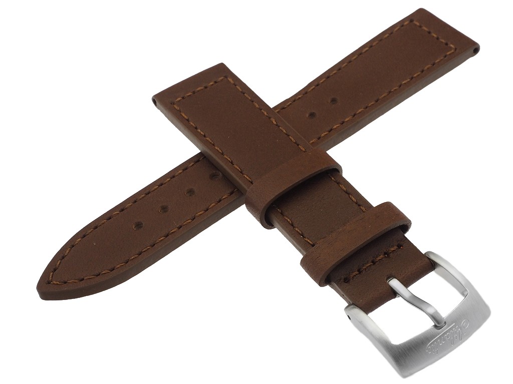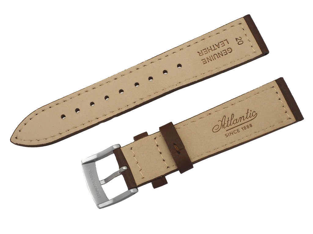 Oryginalny pasek od producenta Atlantic w rozmiarze 20 mm, wykonany ze skóry naturalnej w kolorze brązowym, gładki, matowy, sprzączka wykonana ze stali nierdzewnej w kolorze srebrnym z napisem Atlantic.