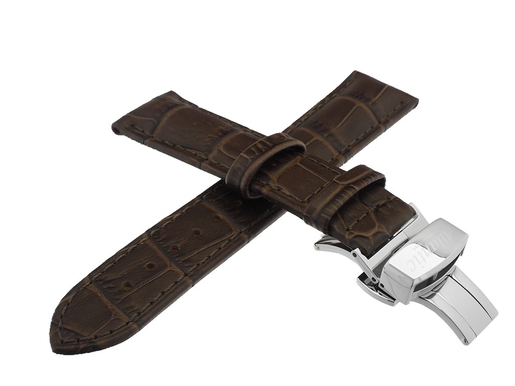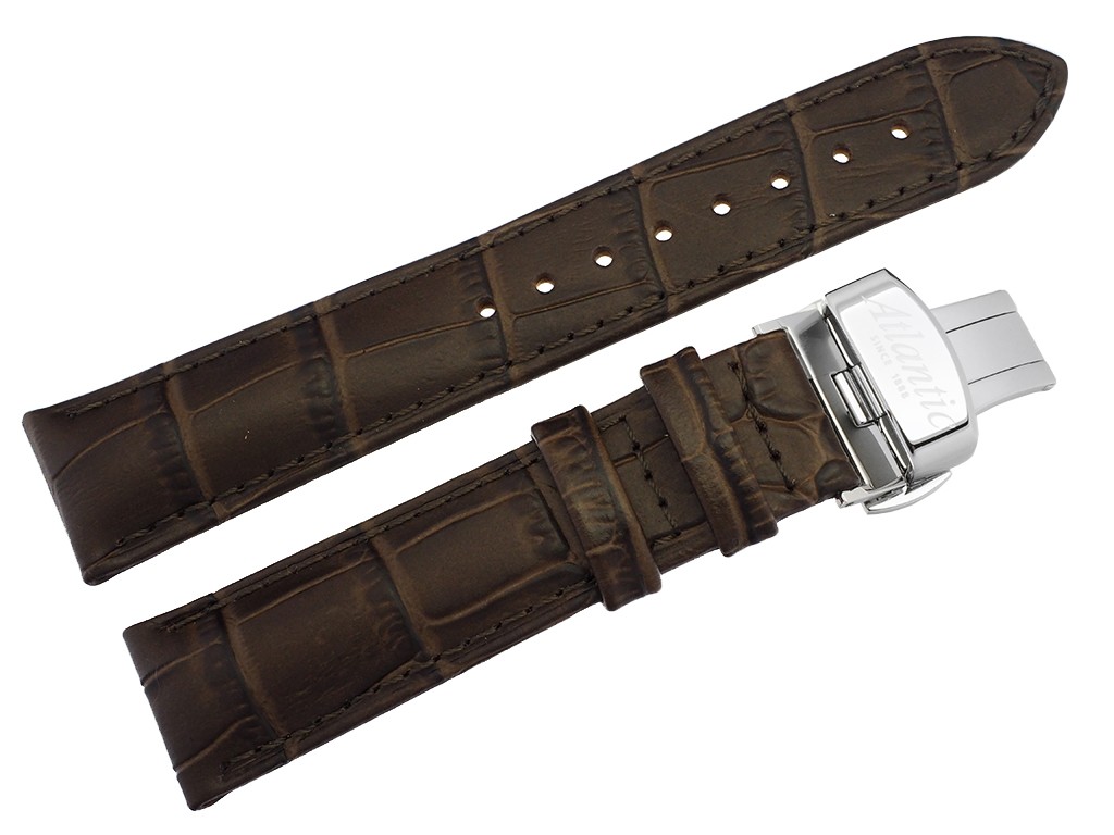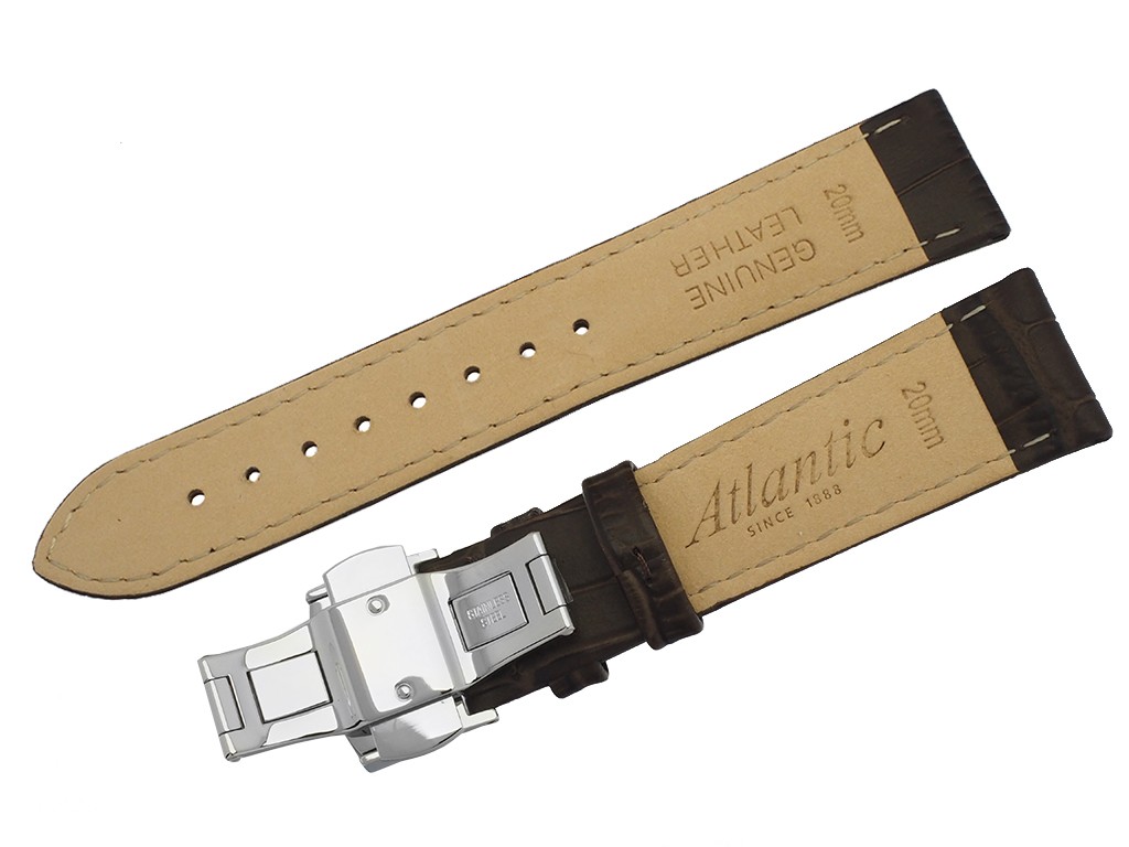 Oryginalny pasek od producenta Atlantic w rozmiarze 20 mm, wykonany ze skóry naturalnej w kolorze brązowym, na pasku tłoczony wzór aligatora, przeszyty, lekko wypełniany, zapięcie typu motylkowe w kolorze srebrnym z wybitym napisem Atlantic. Piękny produkt!