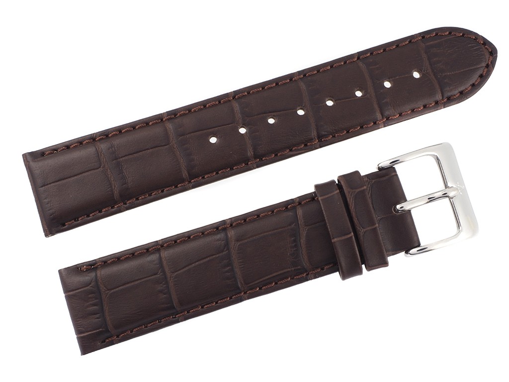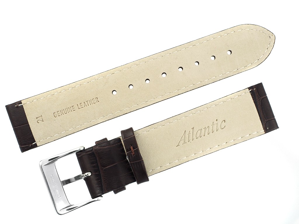 Oryginalny pasek producenta Atlantic w rozmiarze 21 mm, wykonany ze skóry naturalnej w kolorze brązowym, na pasku tłoczony wzór aligatora, przeszyty, sprzączka wykonana ze stali nierdzewnej w kolorze srebrnym, z wybitym logo Atlantic.