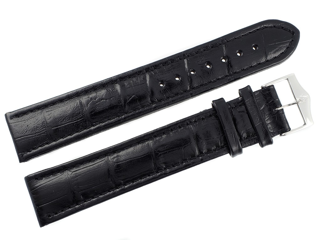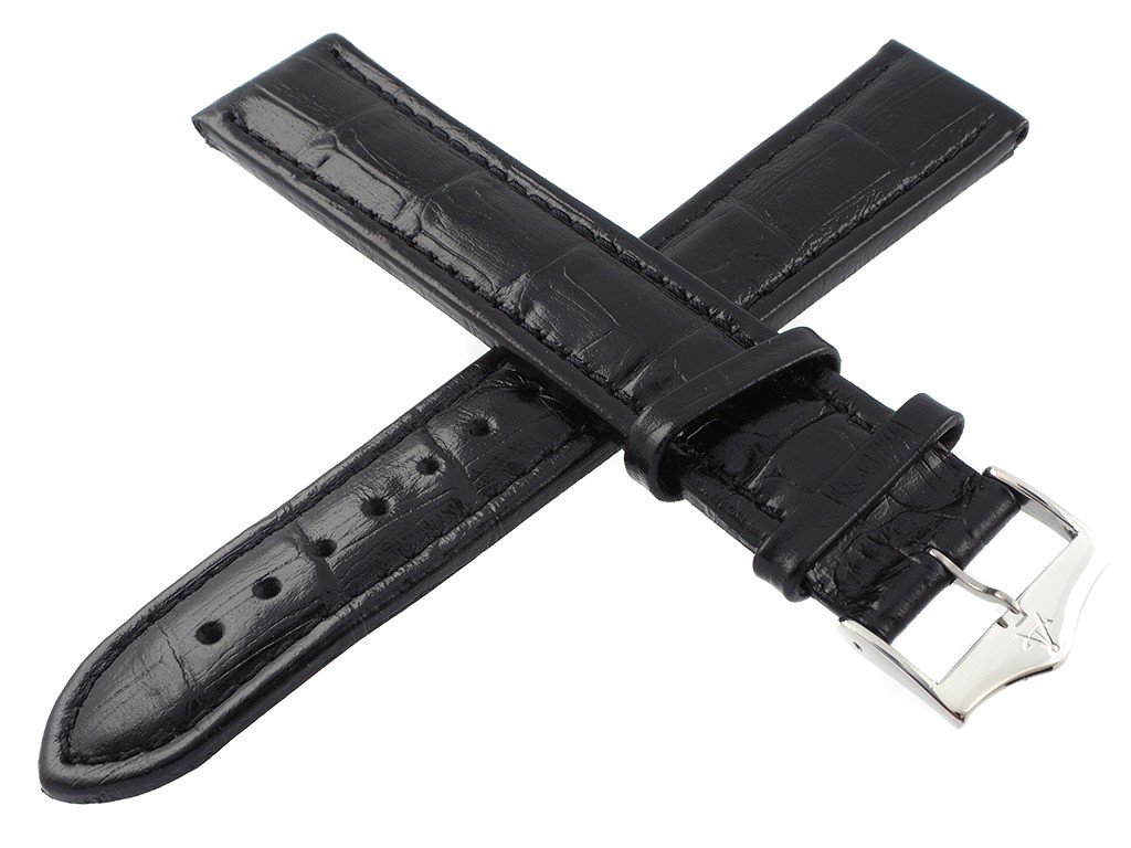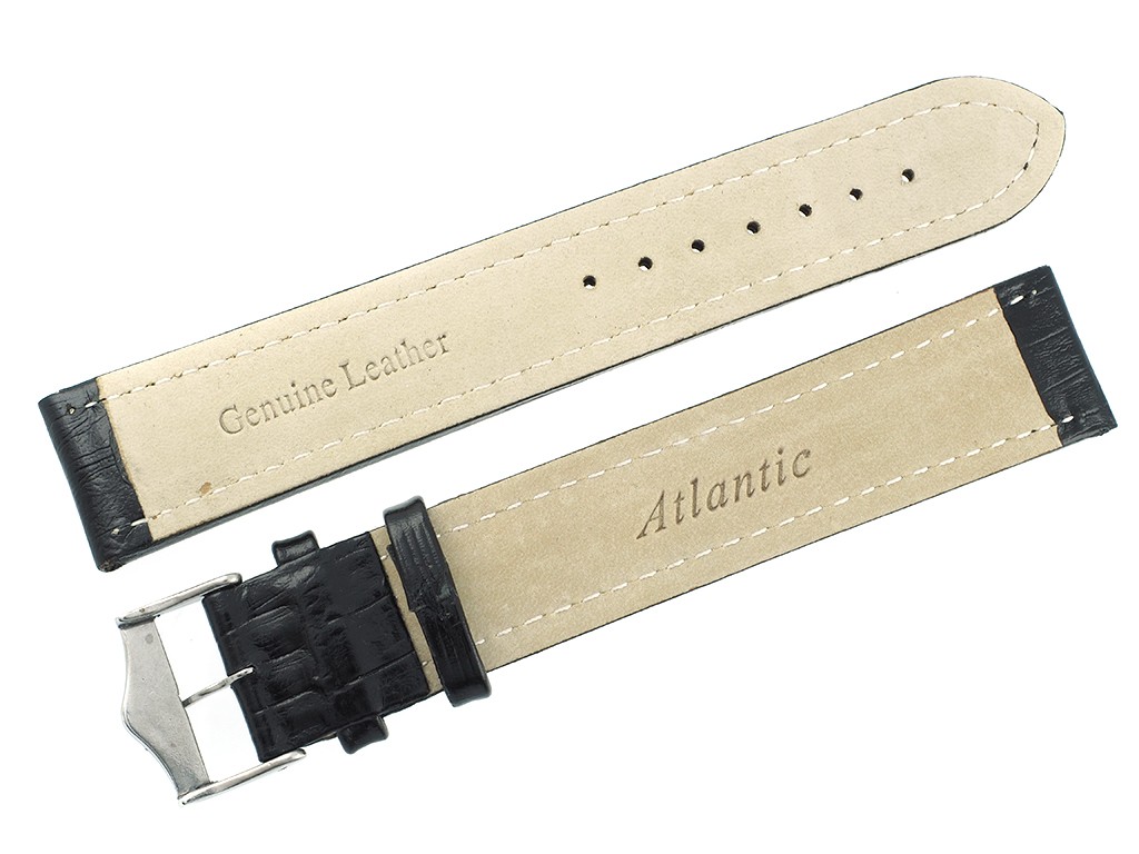 Oryginalny pasek producenta Atlantic w rozmiarze 21 mm, wykonany ze skóry naturalnej w kolorze czarnym, na pasku tłoczony wzór aligatora, przeszyty, sprzączka wykonana ze stali nierdzewnej w kolorze srebrnym, z wybitym logo Atlantic, pasek przedłużany w rozmiarze XL.