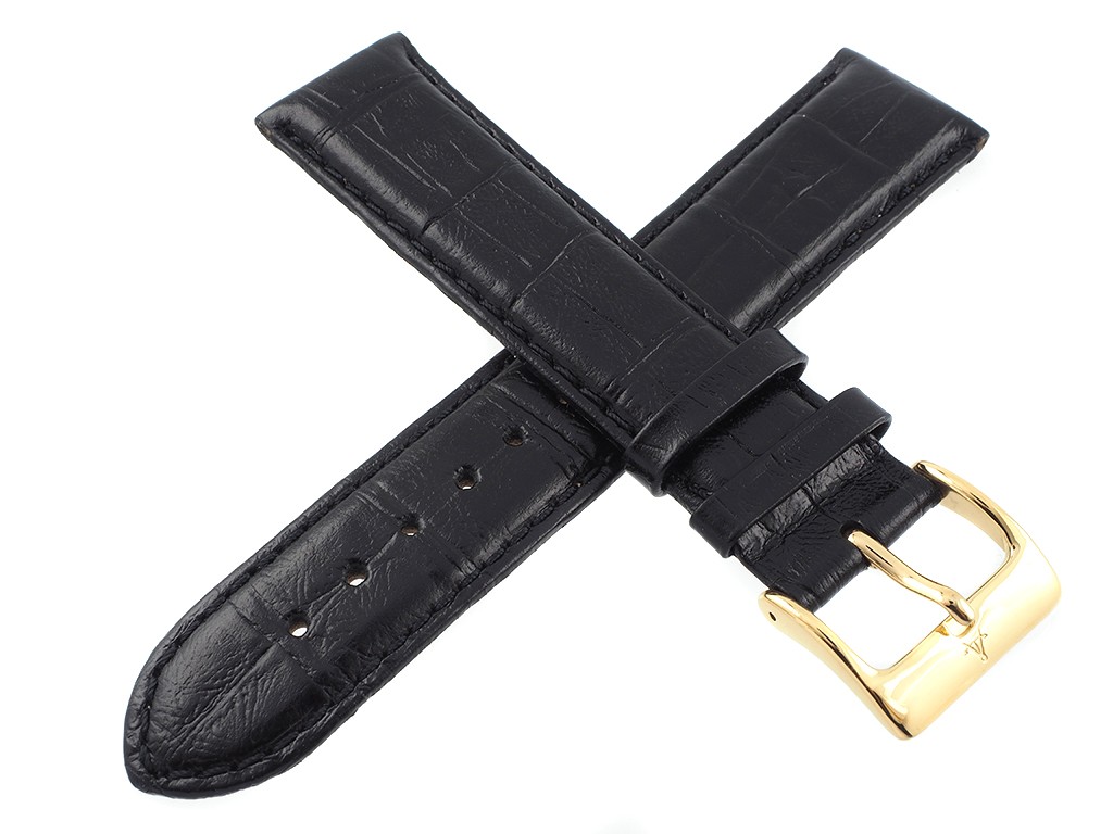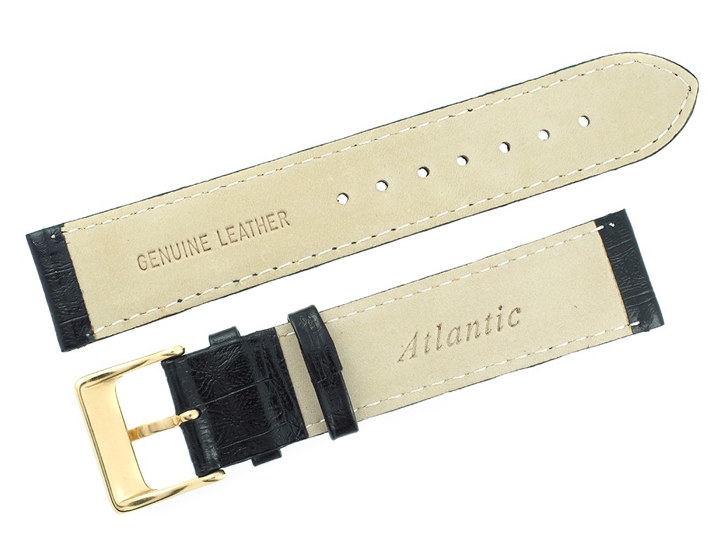 Oryginalny pasek producenta Atlantic w rozmiarze 21 mm, wykonany ze skóry naturalnej w kolorze czarnym, na pasku tłoczony wzór aligatora, przeszyty, sprzączka wykonana ze stali nierdzewnej w kolorze złotym, z wybitym logo Atlantic.