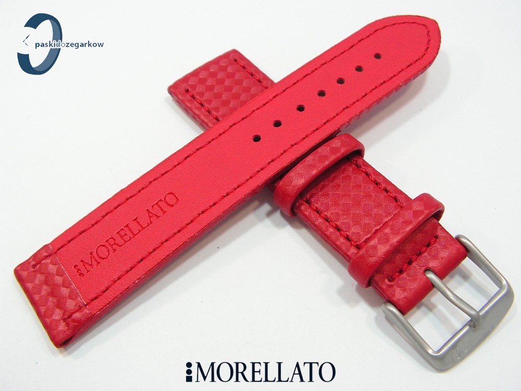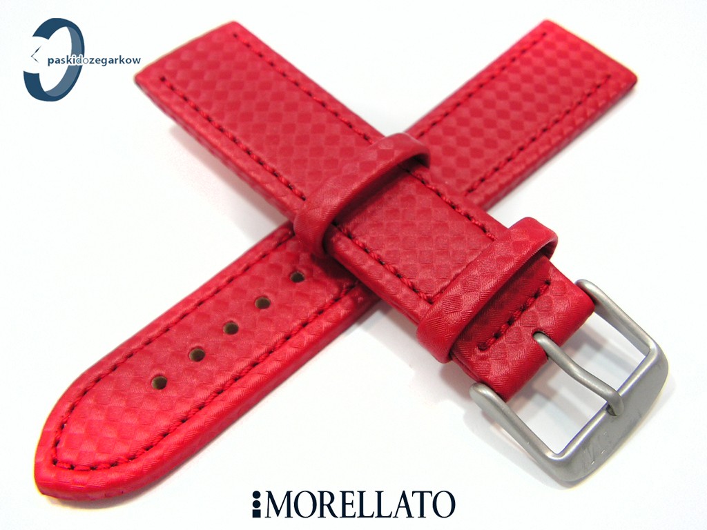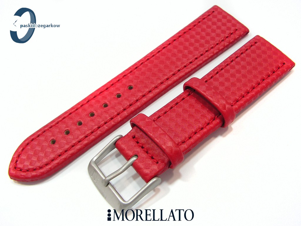 Pasek od producenta Morellato Capoetra wykonany z materiału z wytłoczonym wzorem carbonu, myszówka skórzana, kolor czerwony, przeszycie w kolorze paska, wodoodporny, sprzączka wykonana ze stali nierdzewnej, szerokość paska 22 mm.