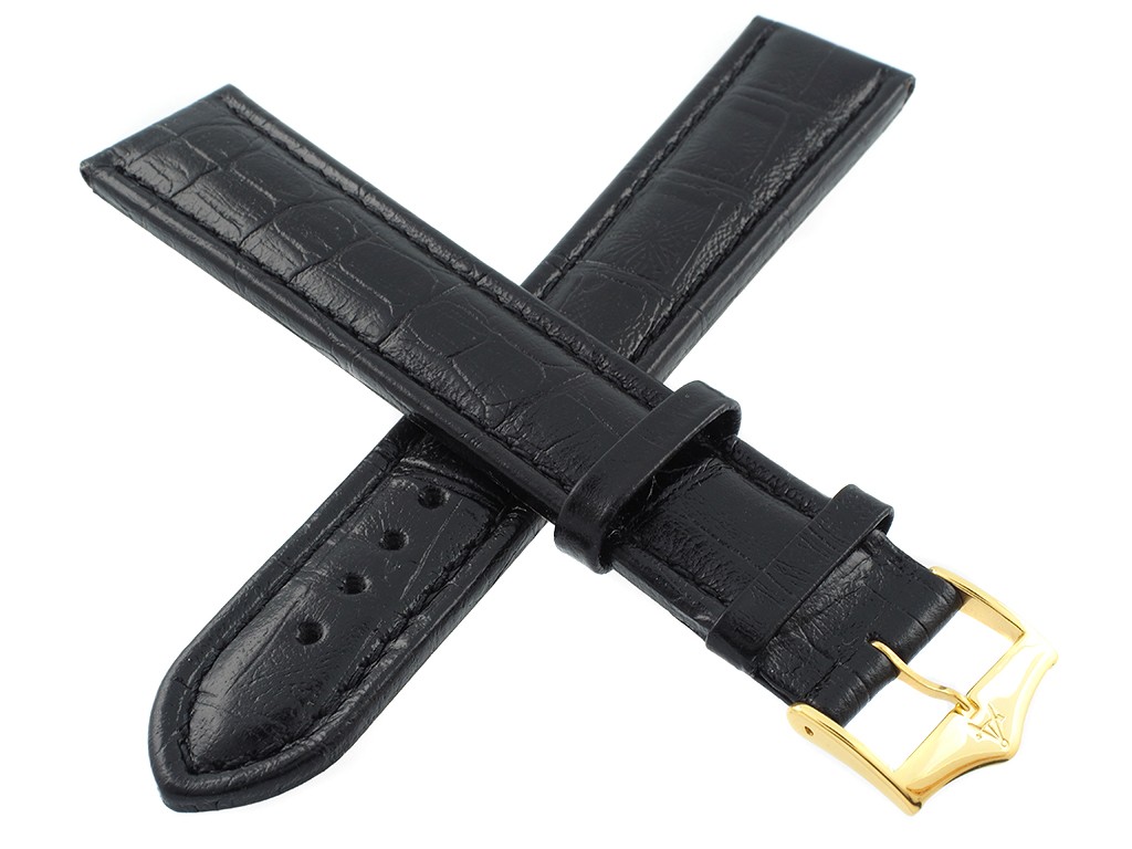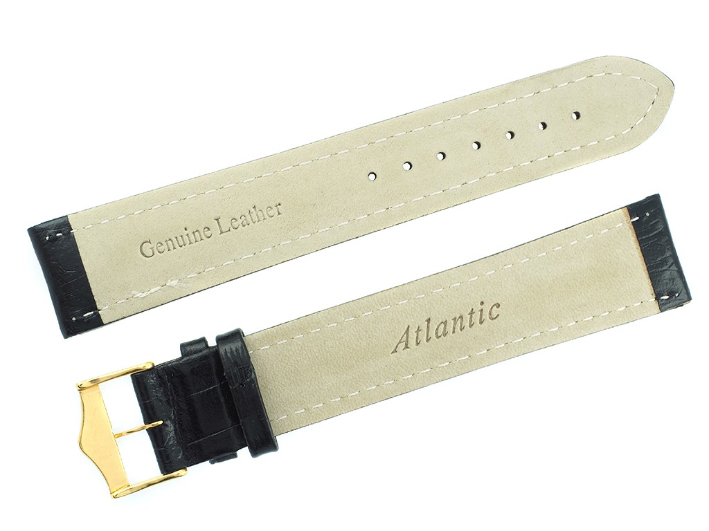 Oryginalny pasek producenta Atlantic w rozmiarze 22 mm, wykonany ze skóry naturalnej w kolorze czarnym, na pasku tłoczony wzór aligatora, przeszyty, sprzączka wykonana ze stali nierdzewnej w kolorze złotym, z wybitym logo Atlantic, pasek przedłużany w rozmiarze XL.