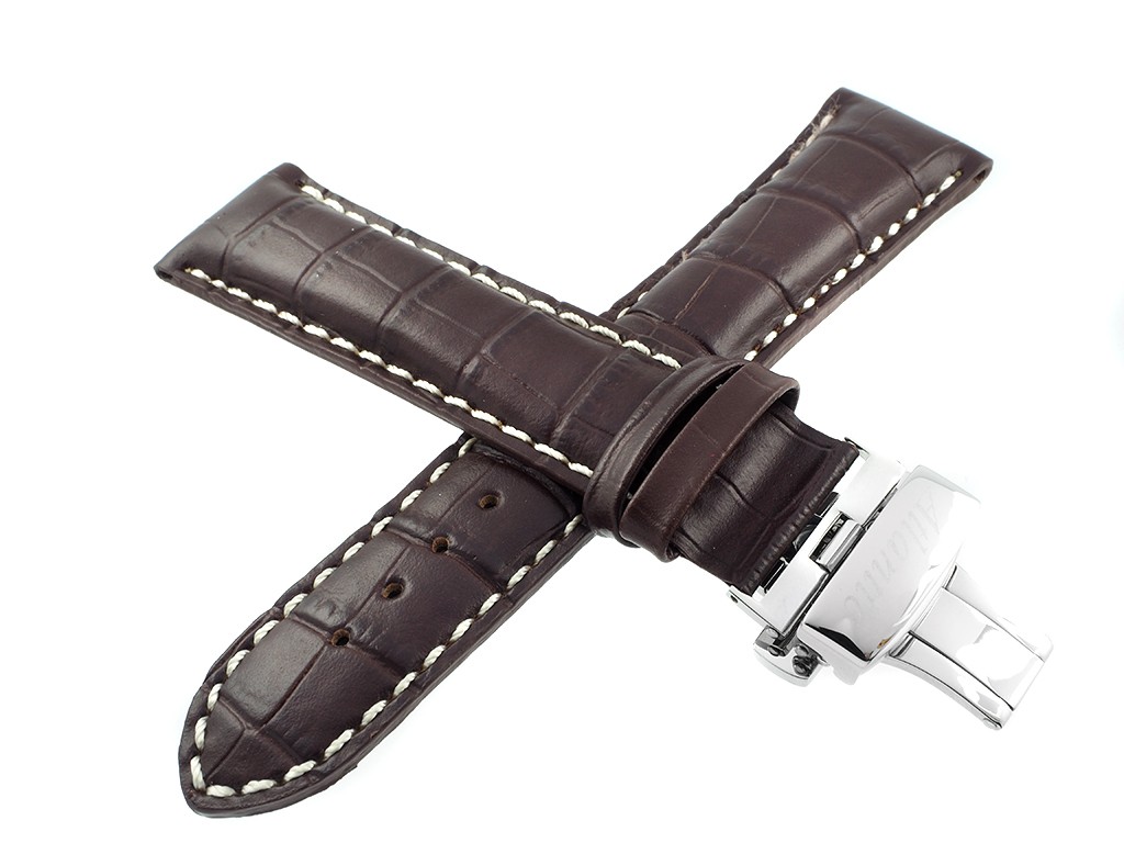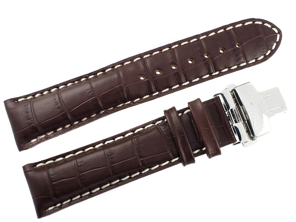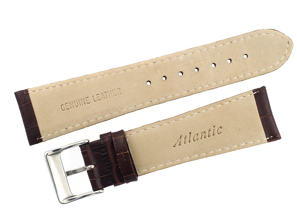 Oryginalny pasek producenta Atlantic w rozmiarze 22 mm, wykonany ze skóry naturalnej w kolorze brązowym, na pasku tłoczony wzór aligatora, przeszyty białą nicią, wypełniany ( do grubości 7 mm), zapięcie typu motylkowe w kolorze srebrnym z wybitym napisem Atlantic.