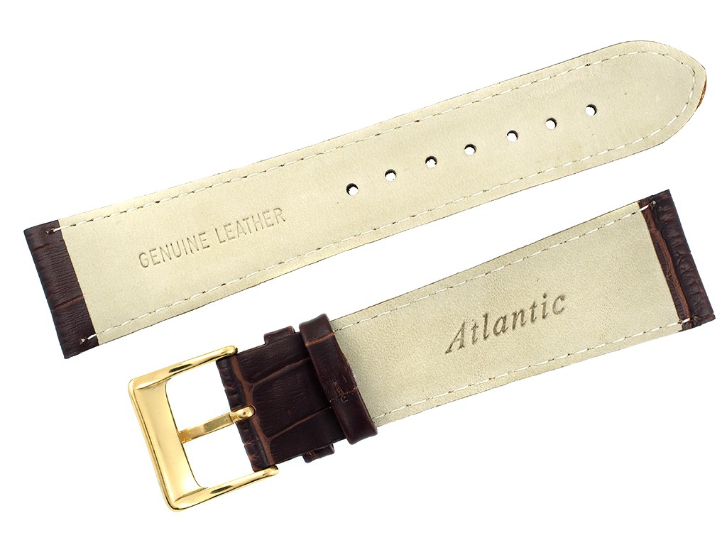 Oryginalny pasek producenta Atlantic w rozmiarze 24 mm, wykonany ze skóry naturalnej w kolorze brązowym matowym, na pasku tłoczony wzór aligatora, przeszyty, sprzączka wykonana ze stali nierdzewnej w kolorze złotym, z wybitym logo Atlantic.