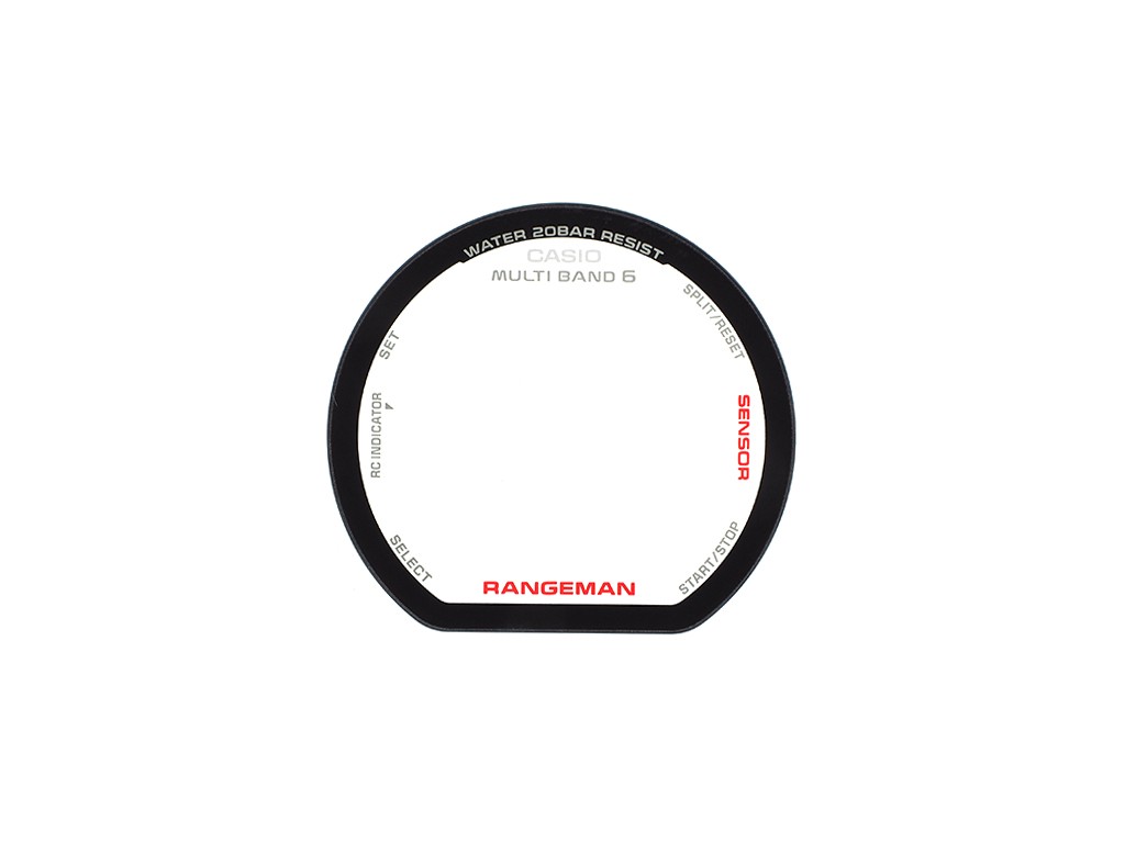 Wyświetl większe Oryginalne szkło do zegarka marki CASIO do modelu GW-9400 z napisami i czarną obramówką na szkle.