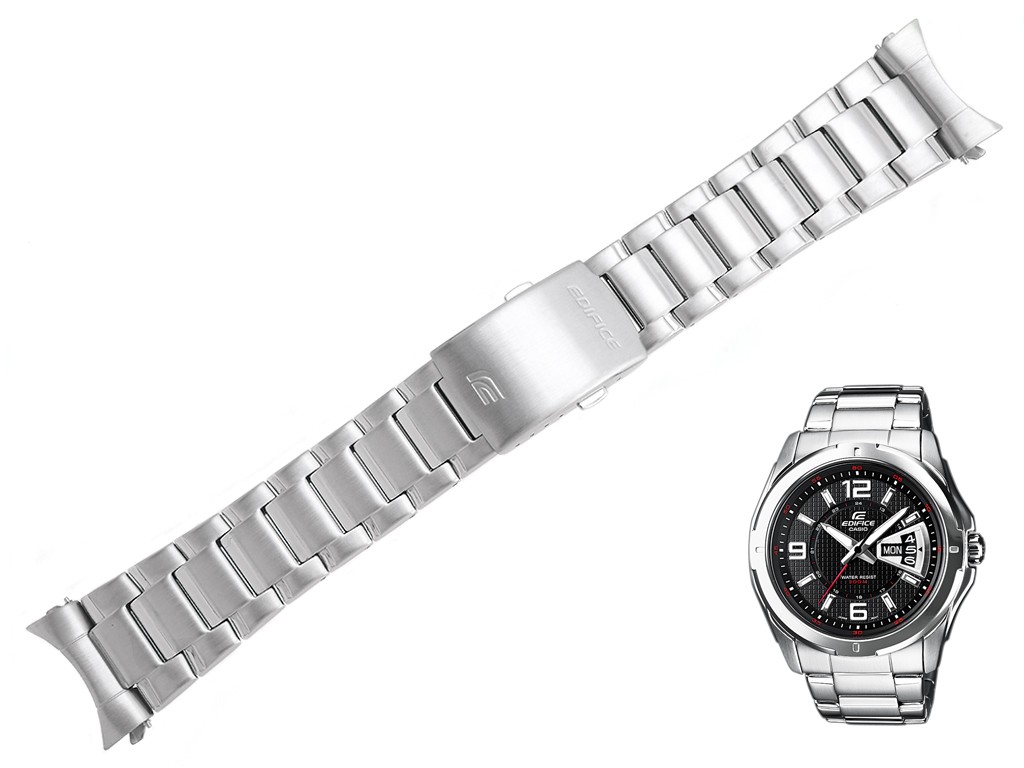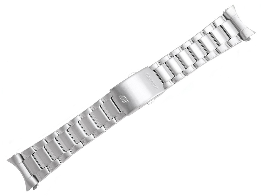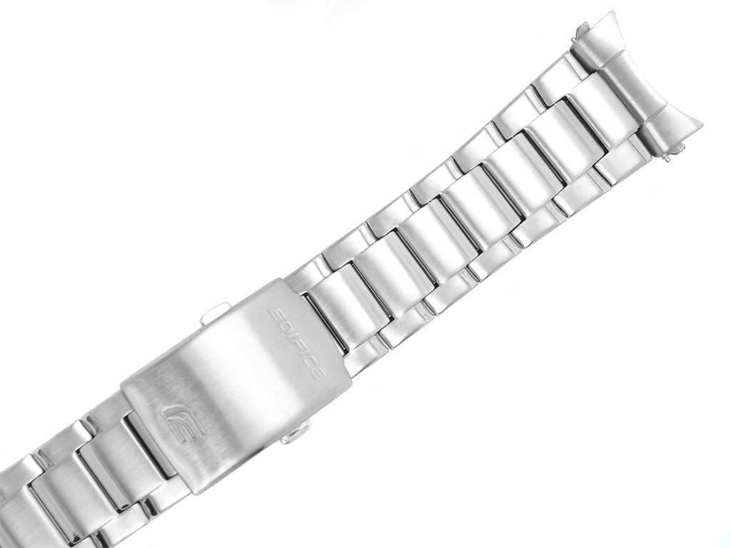Oryginalna bransoleta do zegarka marki Casio Edifice EF-129D, wykonana ze stali nierdzewnej w kolorze srebrnym z maskownicami, na zapięciu wybity napis i logo Edifice.