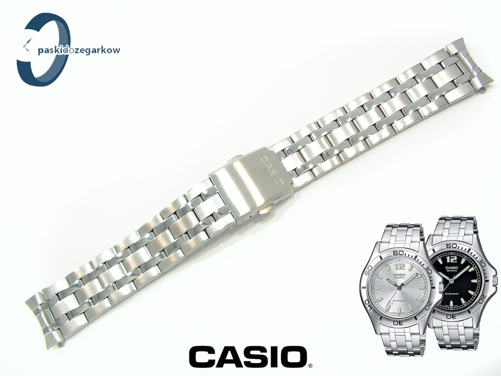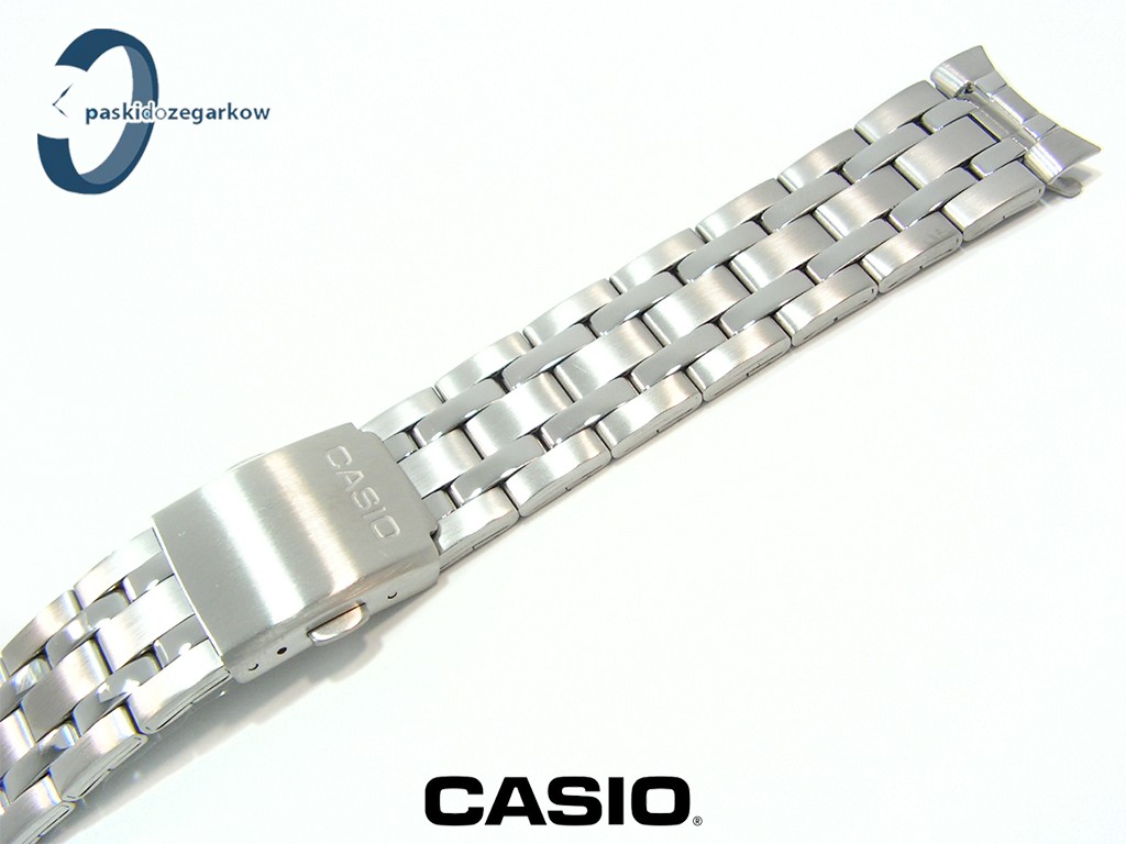 Oryginalna bransoleta do zegarka marki Casio MTP-1258D, wykonana ze stali nierdzewnej w kolorze srebrnym, na zapięciu wybity napis Casio, z maskownicami.