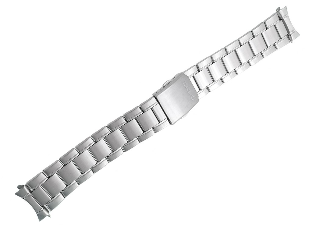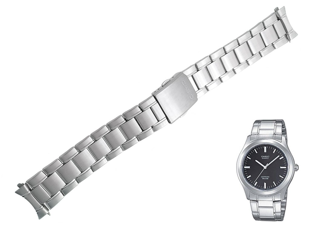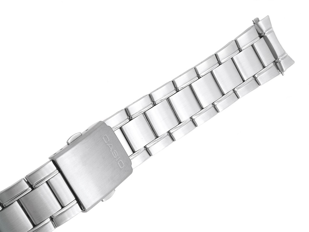 Oryginalna bransoleta do zegarka marki Casio MTP-1200A, wykonana ze stali nierdzewnej w kolorze srebrnym, na zapięciu wybity napis Casio, z maskownicami.