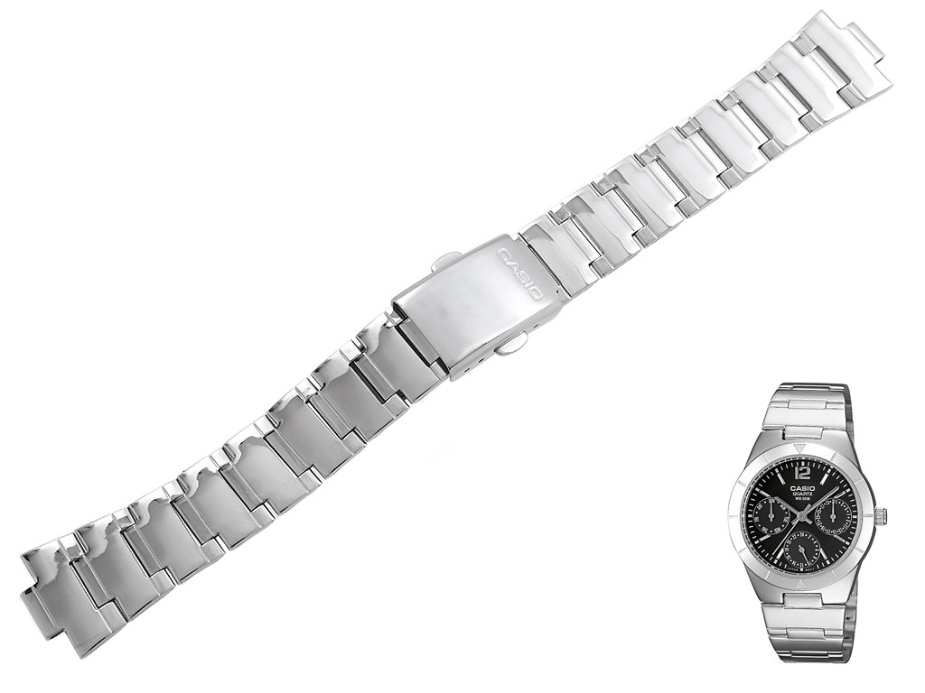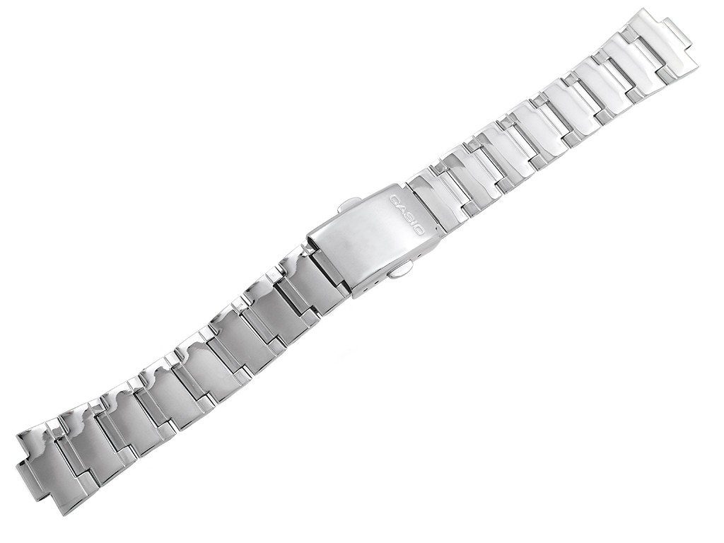 Oryginalna bransoleta do zegarka marki Casio LTP-2069D, wykonana ze stali nierdzewnej w kolorze srebrnym, na zapięciu wybity napis Casio.