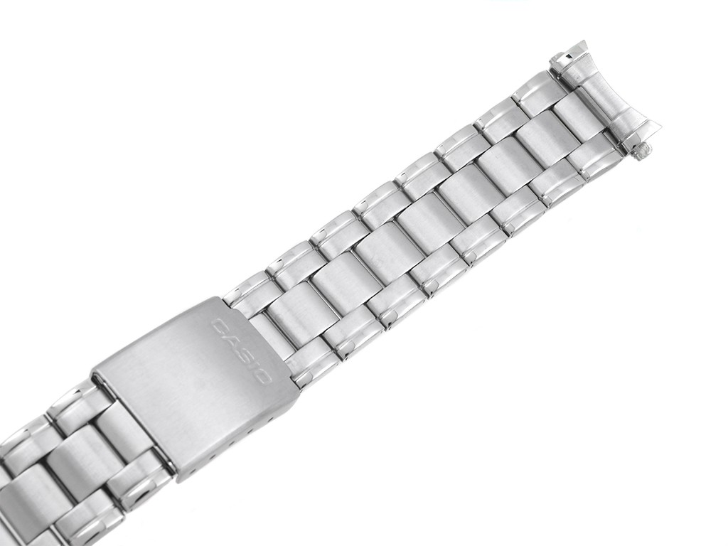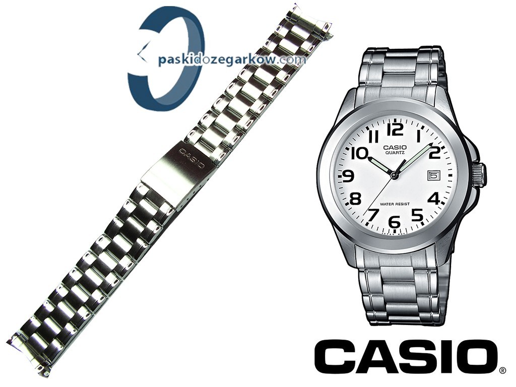 Oryginalna bransoleta do zegarka marki Casio MTP-1259D, wykonana ze stali nierdzewnej w kolorze srebrnym, na zapięciu wybity napis Casio, z maskownicami.