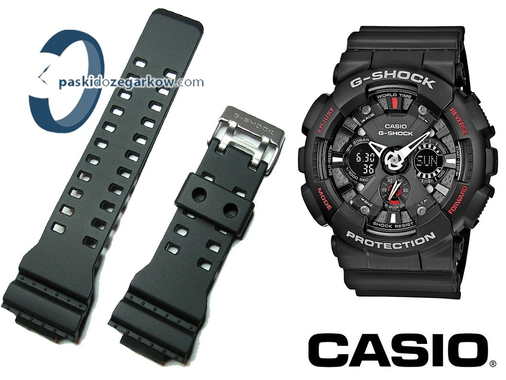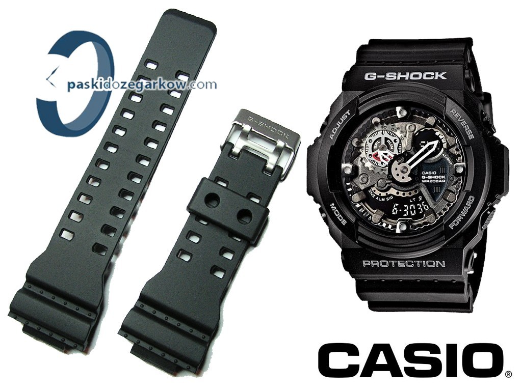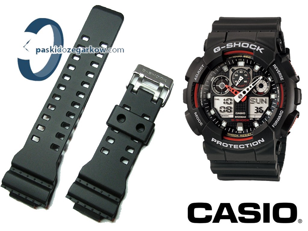 Oryginalny pasek do zegarka Casio G-Shock do modeli GA-100,GA-110, G-8900, GA-120, GA-300 wykonany z tworzywa, kolor czarny matowy, sprzączka wykonana ze stali nierdzewnej.