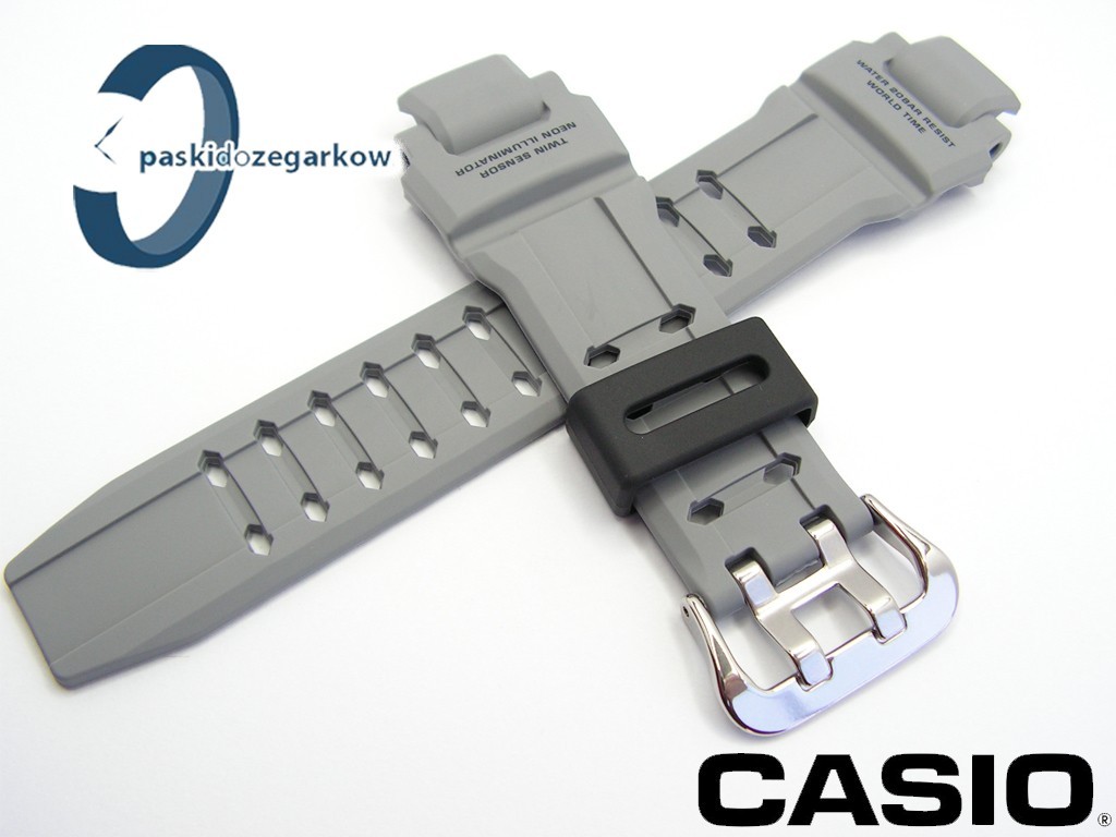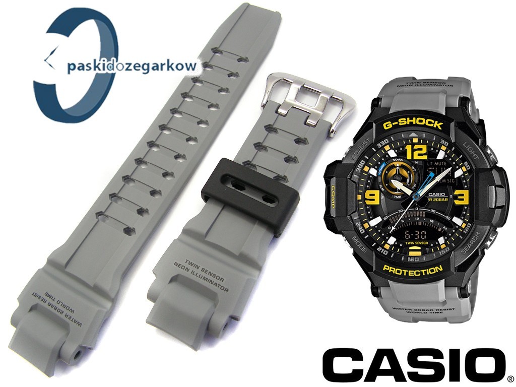 Oryginalny pasek do zegarka Casio G-SHOCK do modelu GA-1000 w kolorze szarym, na pasku oryginalne napisy, sprzączka wykonana ze stali nierdzewnej, szlufka w kolorze czarnym.