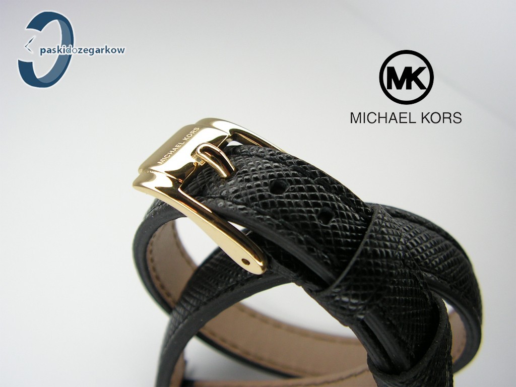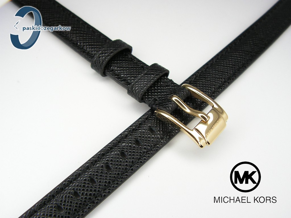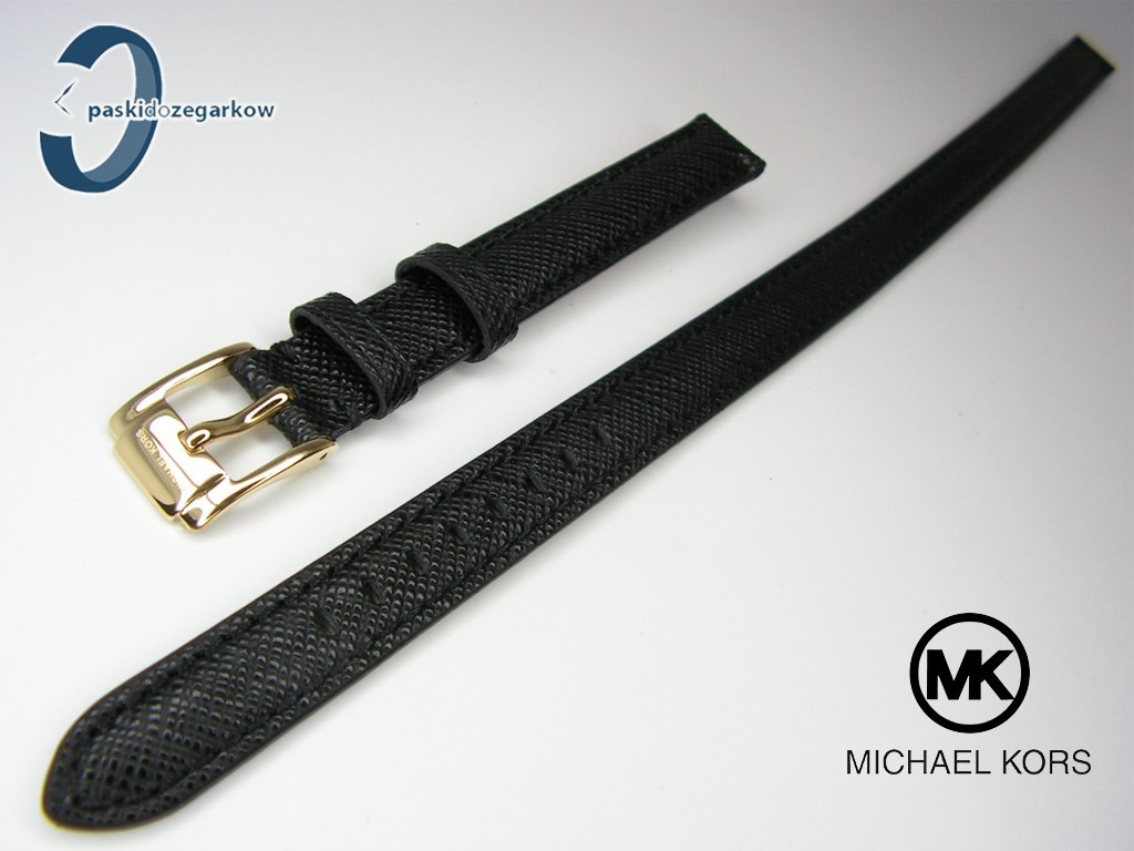 Orygianlny pasek do zegarka marki Kichael Kors do modelu MK2468 skórzany, w kolorze czarnym, przeszyty czarną nicią, na pasku oryginalne tłoczenie, rozmiar paska 12 mm, pasuje do innych modeli z rozstawem koperty 12 mm, sprzączka stalowa w kolorze złotym z napisem Michael Kors, zapinany na teleskopy, dwa stalowe teleskopy w komplecie.