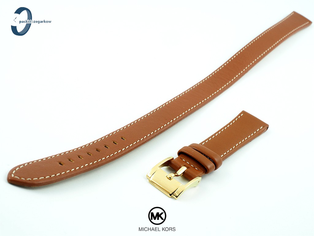 Oryginalny pasek do zegarka Michael Kors do modelu MK2769 typu makaron wykonany ze skóry w kolorze średni brąz, przeszyty jasną nicią, gładki, sprzączka wykonana ze stali nierdzewnej w kolorze złotym.