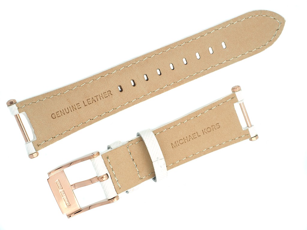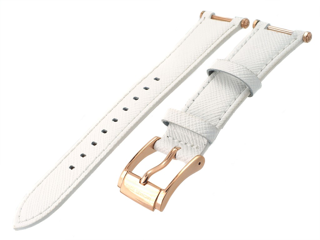 Oryginalny pasek do zegarka marki Michel Kors do modelu MK2281, wykonany ze skóry naturalnej w kolorze białym, na pasku tłoczony wzór, profilowany do koperty zegarka, sprzączka wykonana ze stali nierdzewnej w kolorze różowe złoto, z napisem Michael Kors.