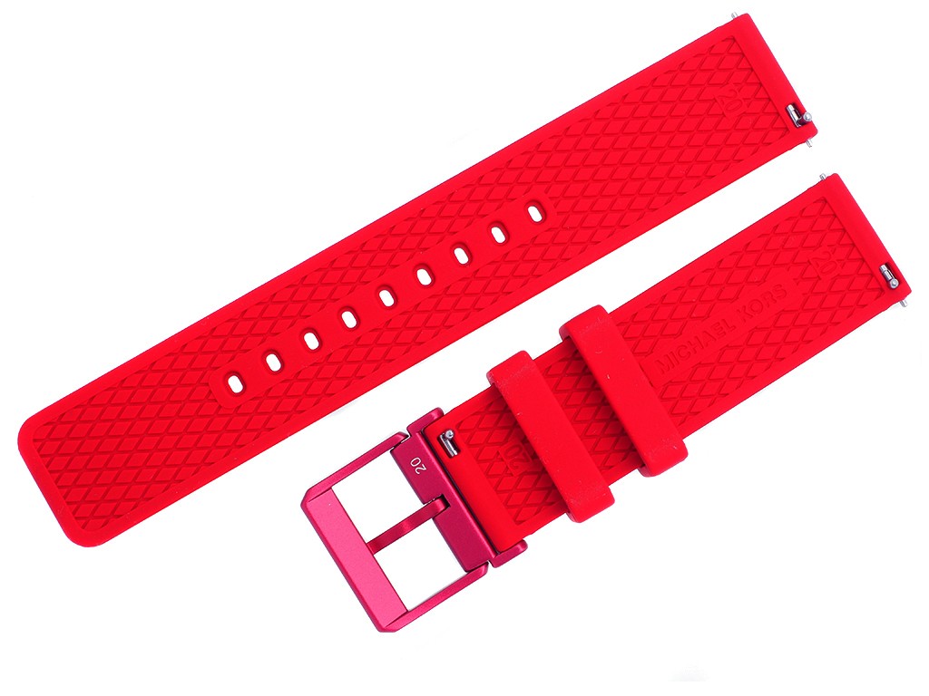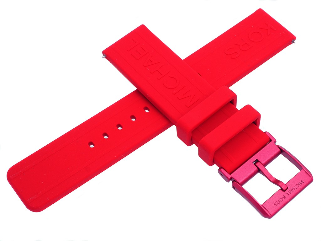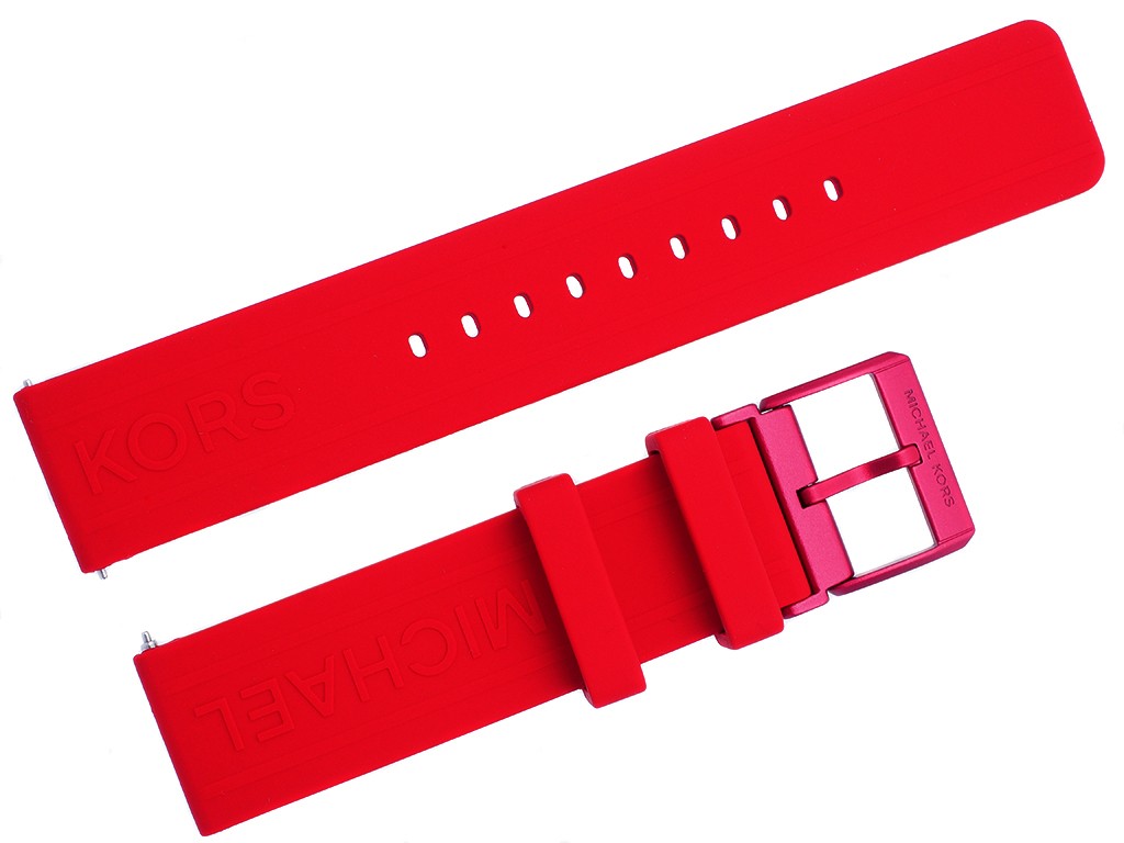 Oryginalny pasek do zegarka marki Michel Kors do modelu MKT5073, wykonany z silikonu w kolorze czerwonym , gładki, na pasku tłoczony napis Michael Kors, sprzączka wykonana ze stali nierdzewnej w kolorze czerwonym z napisem Michael Kors.