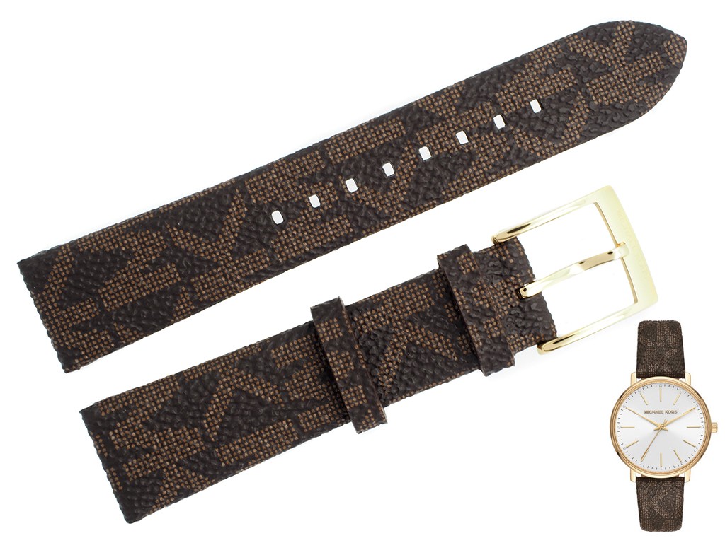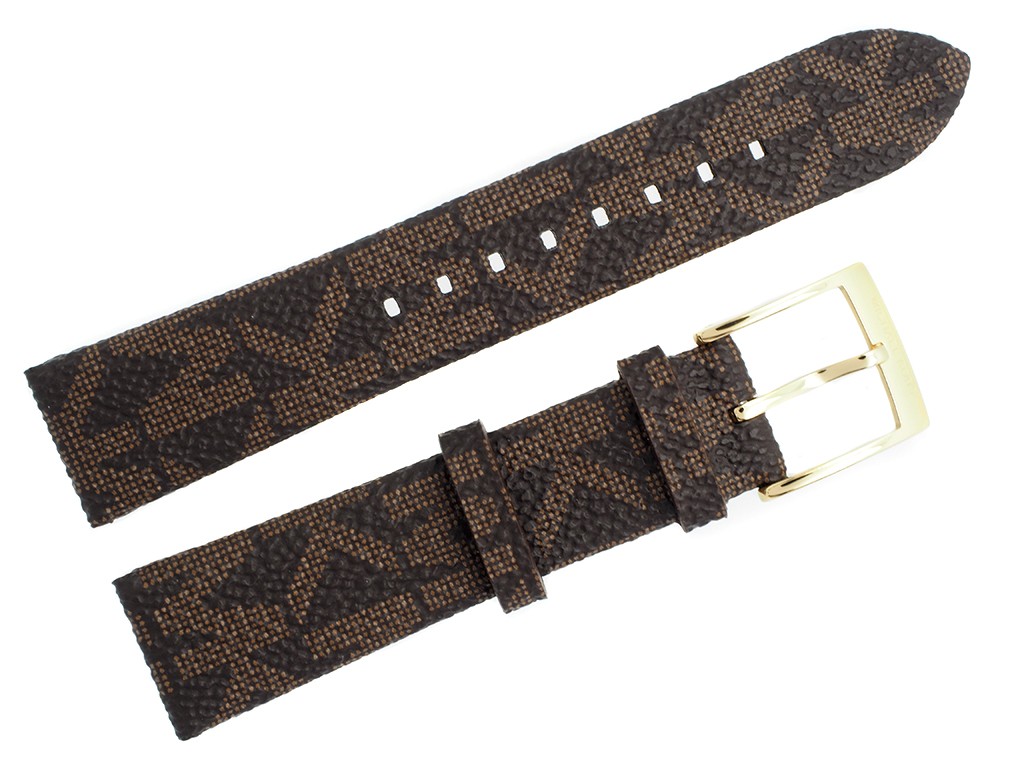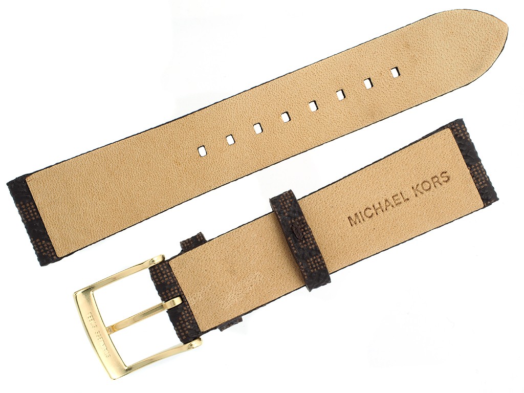 Oryginalny pasek do zegarka marki Michel Kors do modelu MK2857, wykonany ze skóry naturalnej w kolorze brązowym, na pasku oryginalny wzór logo MK, sprzączka wykonana ze stali nierdzewnej w kolorze złotym z napisem Michael Kors.