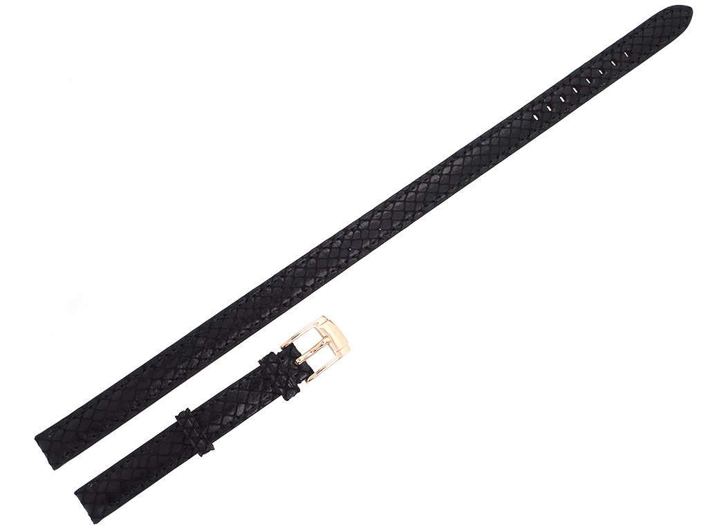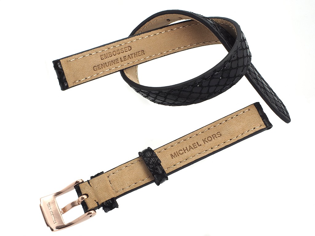 Oryginalny pasek do zegarka marki Michael Kors SLIM RUNWAY do modelu MK2322, wykonany ze skóry naturalnej w kolorze czarnym, na pasku tłoczony motyw węża, lekki połysk, przeszyty, sprzączka wykonana ze stali nierdzewnej w kolorze różowe złoto z napisem Michael Kors, pasek typu makaron, oplata dwa razy rękę.