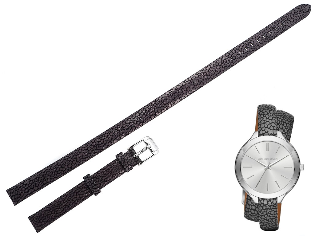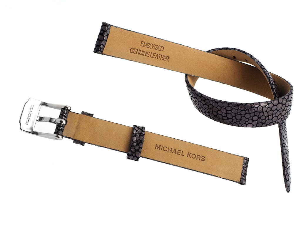 Oryginalny pasek do zegarka marki Michael Kors SLIM RUNWAY do modelu MK2475, wykonany ze skóry naturalnej w kolorze chłodny brąz, na pasku tłoczony motyw jaszczurki, lekki połysk, sprzączka wykonana ze stali nierdzewnej w kolorze srebrnym z napisem Michael Kors, pasek typu makaron, oplata dwa razy rękę.